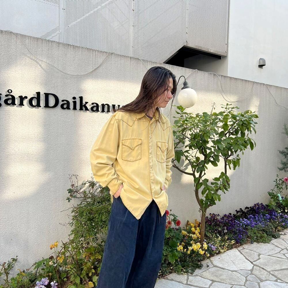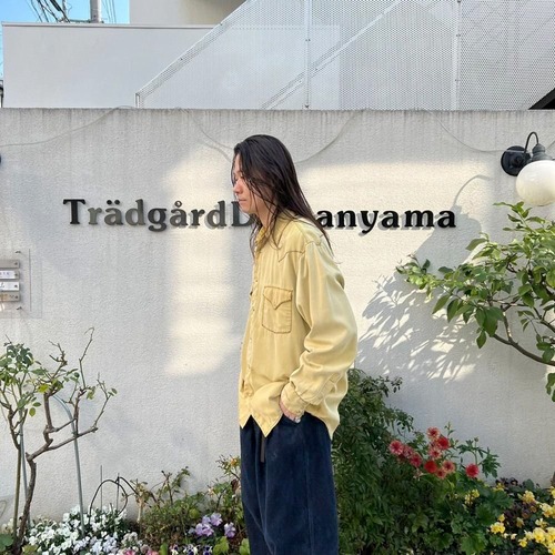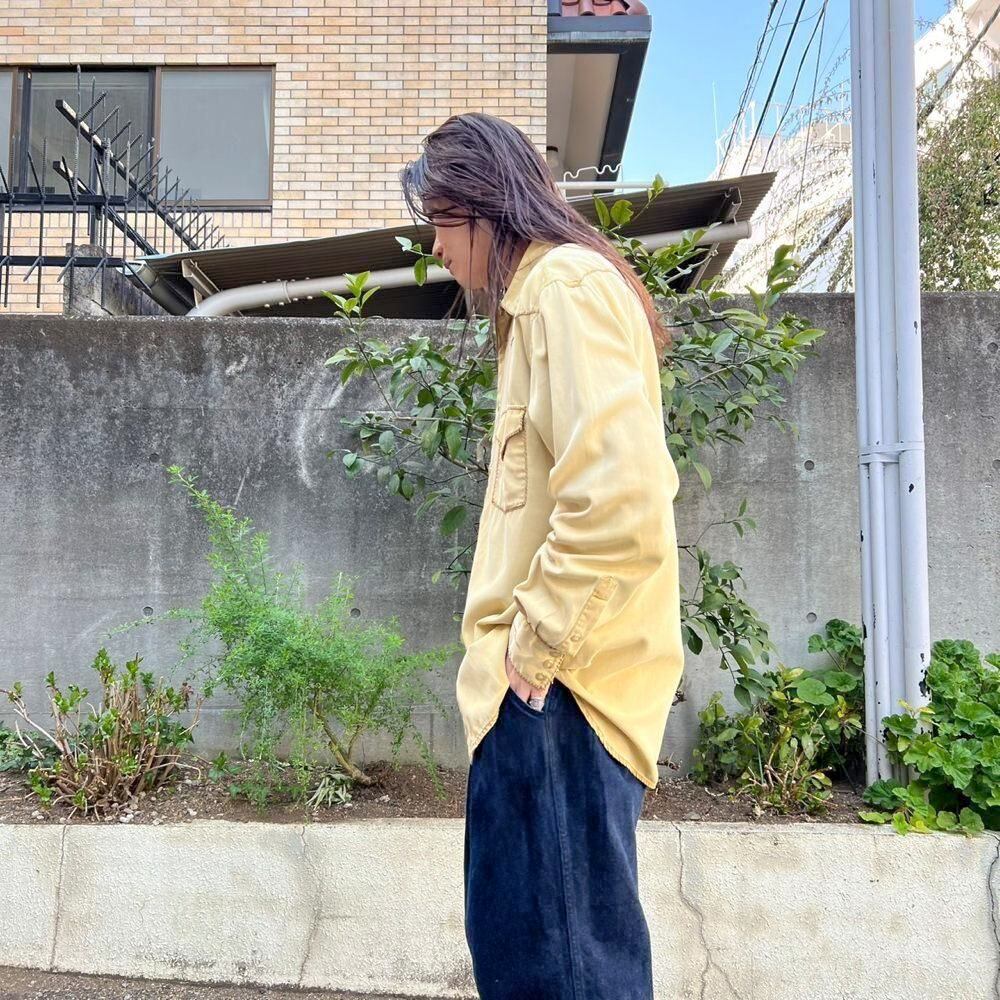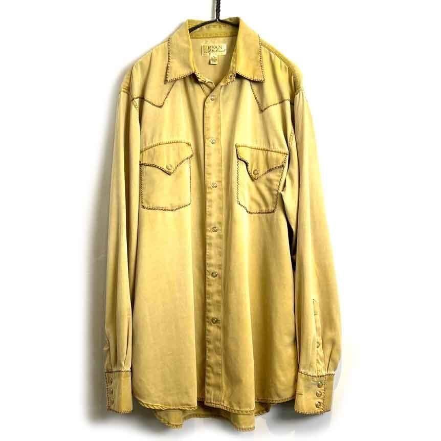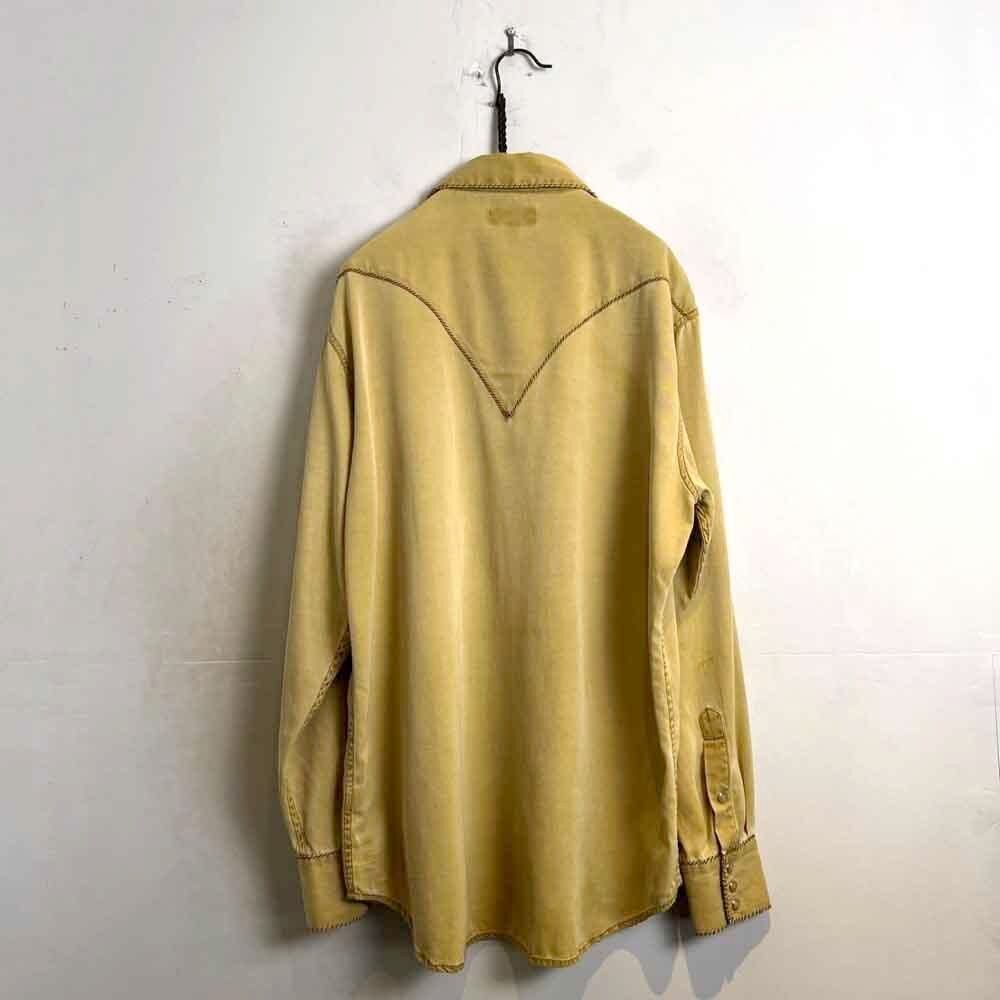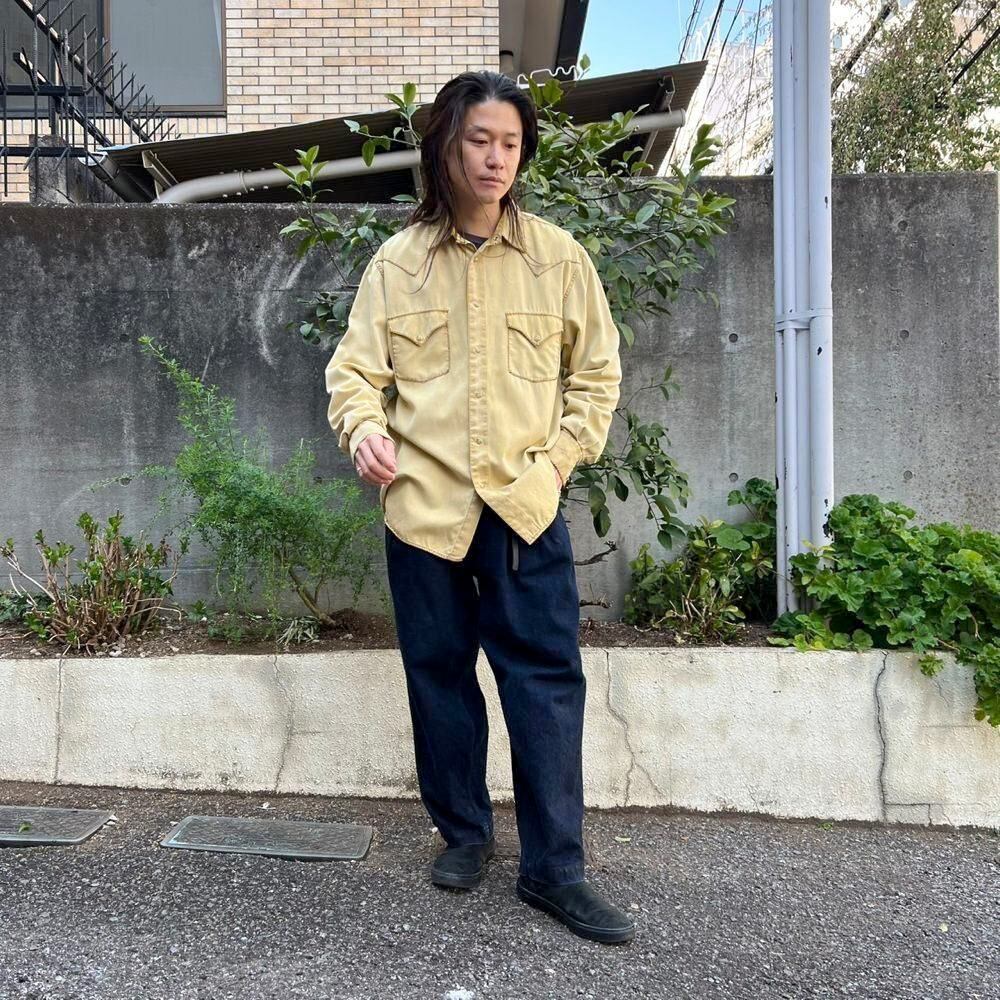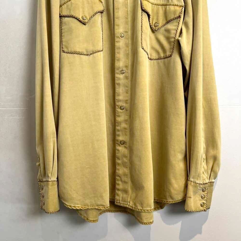 Western shirt from the 90s. Made of silk and cotton, this shirt has a soft, smooth texture that feels great against the skin. A sophisticated grayish mustard color. The collar, yoke, and pockets are piping-stitched for a detailed look. A relaxed silhouette that is rare for vintage western shirts.