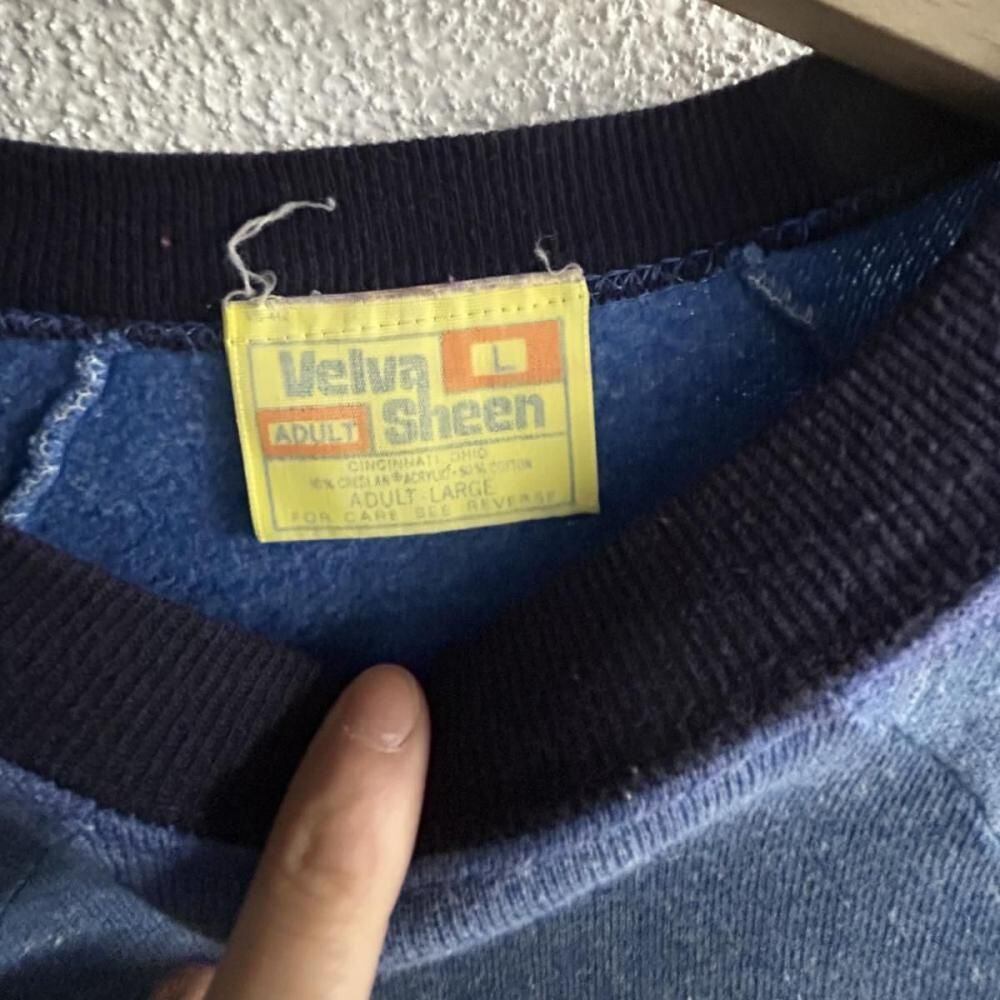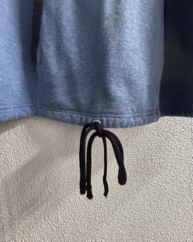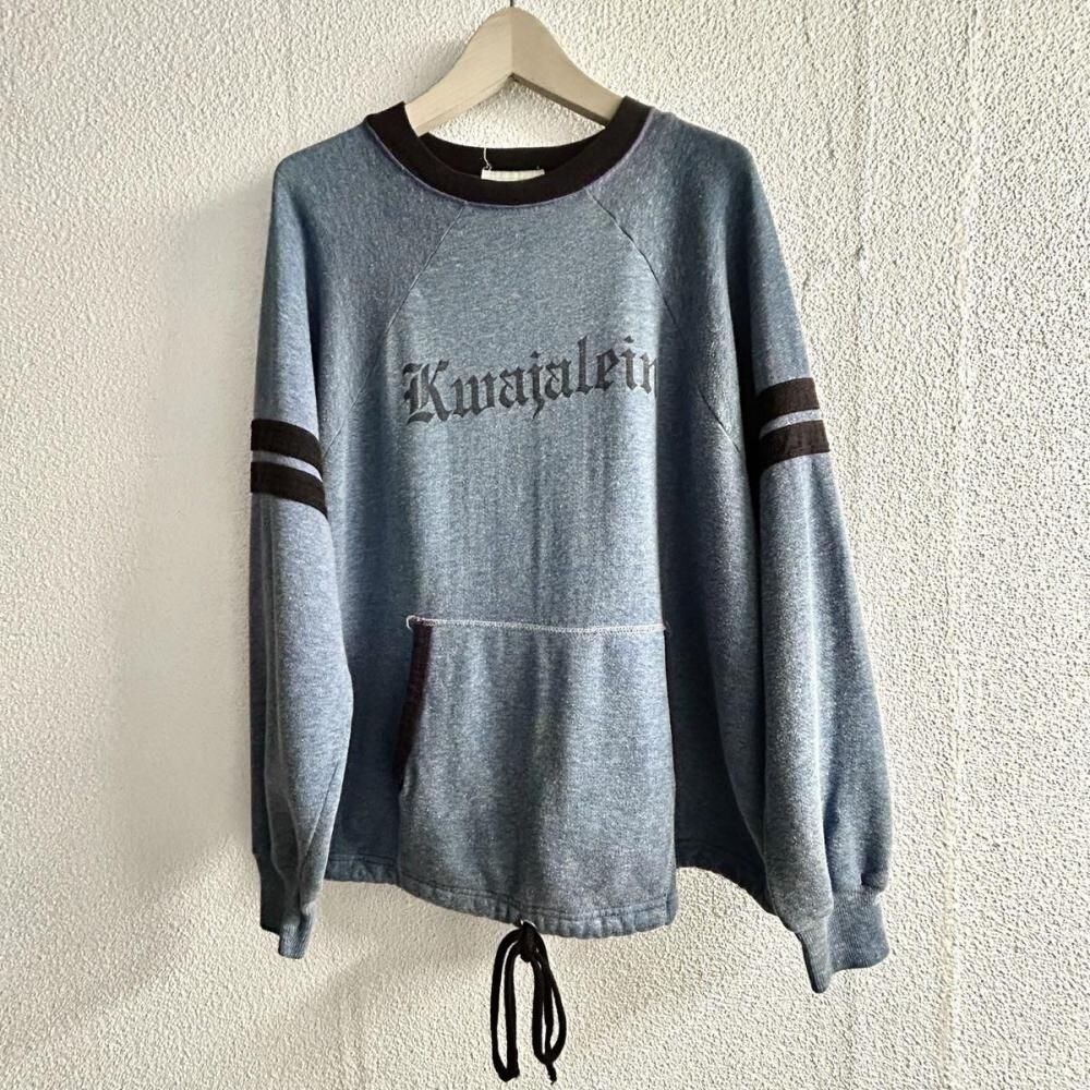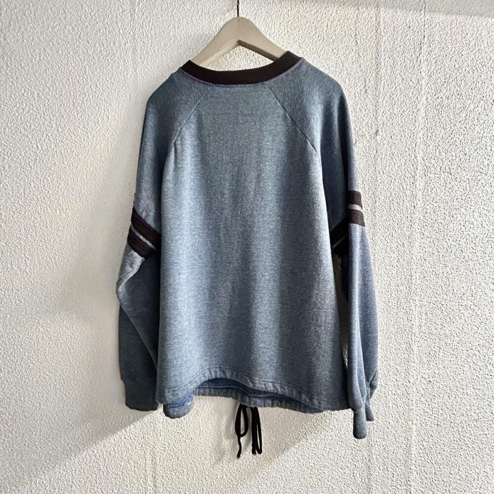 A crew neck sweatshirt with a very rare design from Belvasine from the late 1970s. A ringer style with striped patches on the sleeves, and different fabrics on the neck and pocket edges. It is rare to have pockets, but the cord on the hem is also a rare design. The L size has a moderately loose silhouette and a deep vintage coloring. Since it is an old item, there may be some aging. Please check the photos and understand the characteristics of vintage items before purchasing.