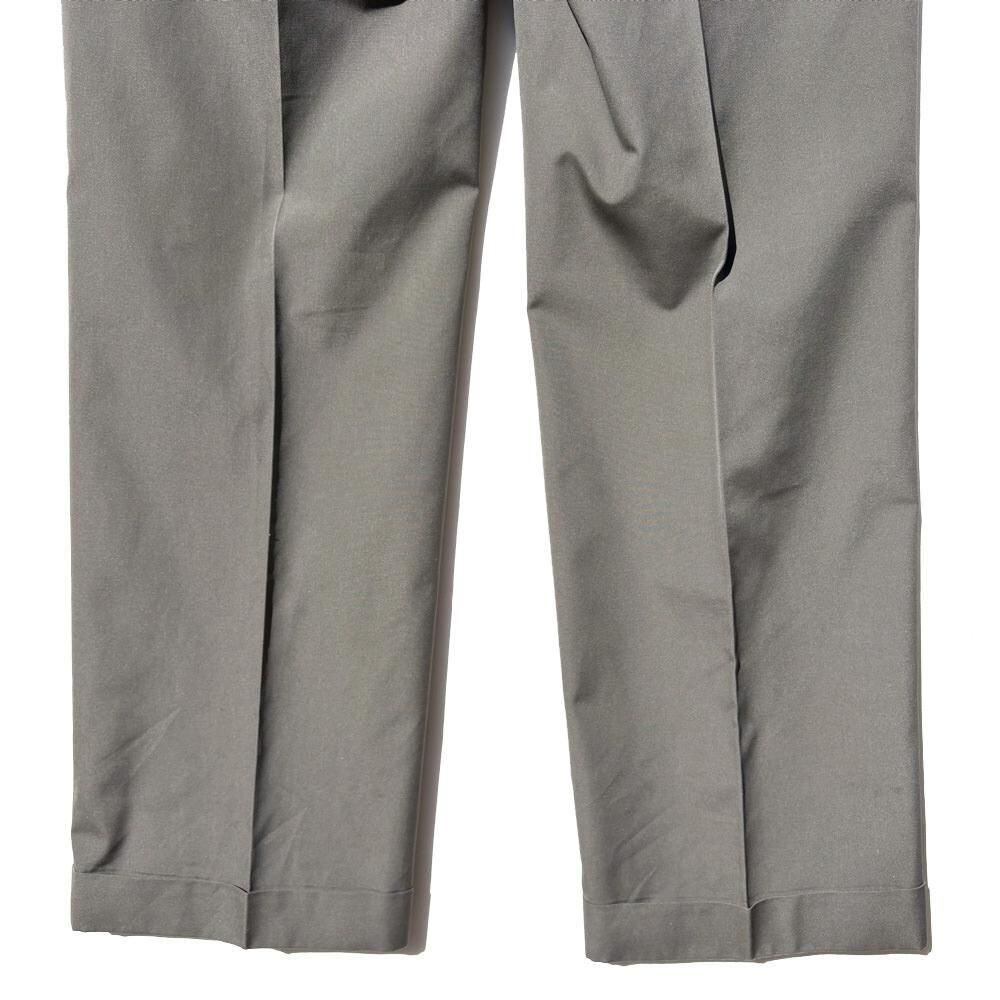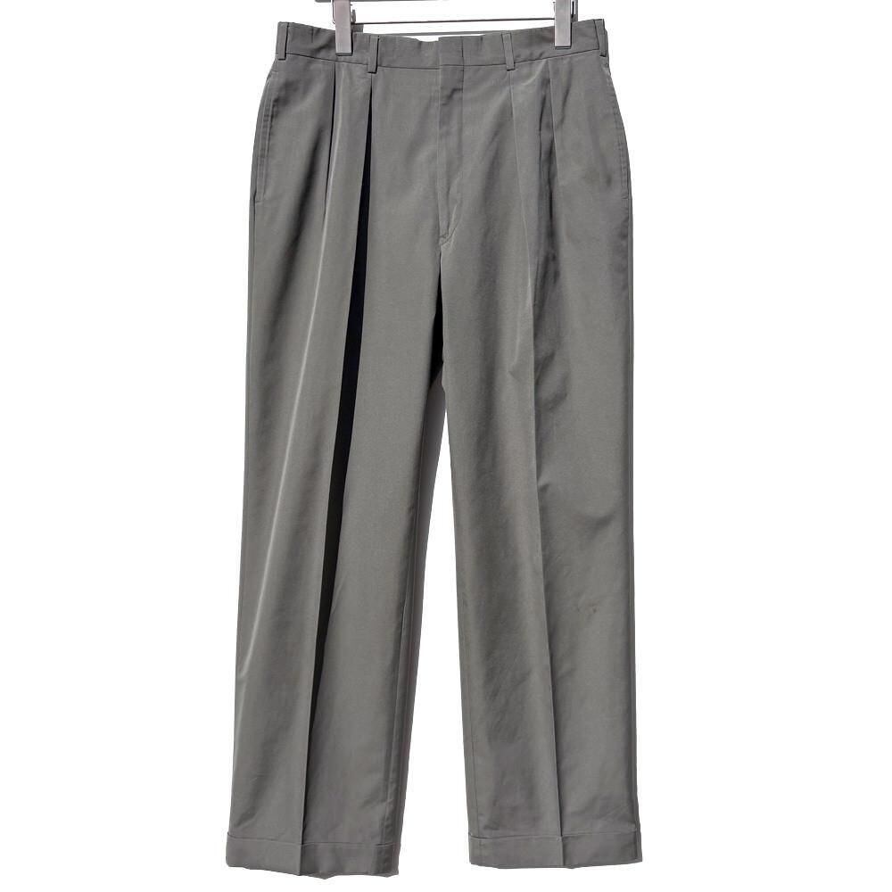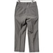 The jacket has two buttons and a moderately shaped, vertical silhouette, while the trousers have a relaxed silhouette with two tapered tucks.