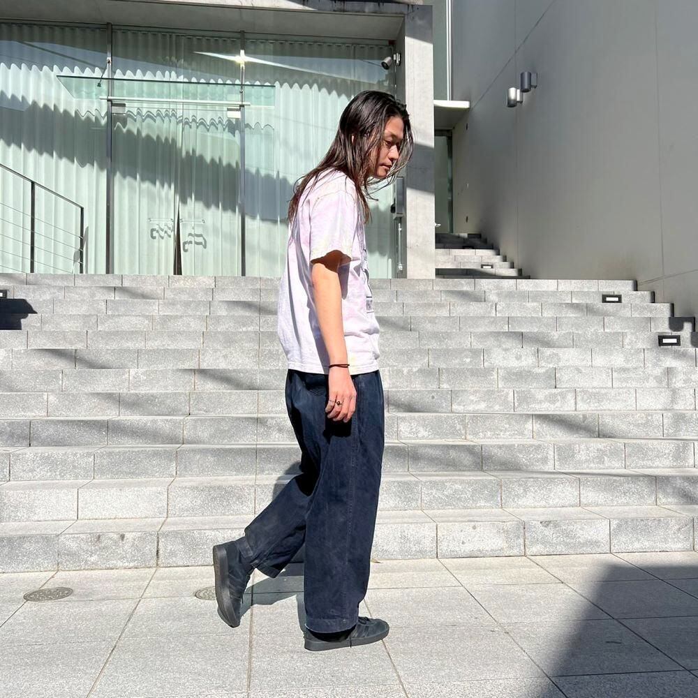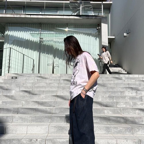 This is a tie-dye parody T-shirt with the motif of Pepe the Skunk, a character from the Looney Tunes series. The pink, grey and yellow tie-dye colours and the mysterious print create a great atmosphere. The body is a Pro Club XL size, and it is a comfortable piece with a moderately loose fit.