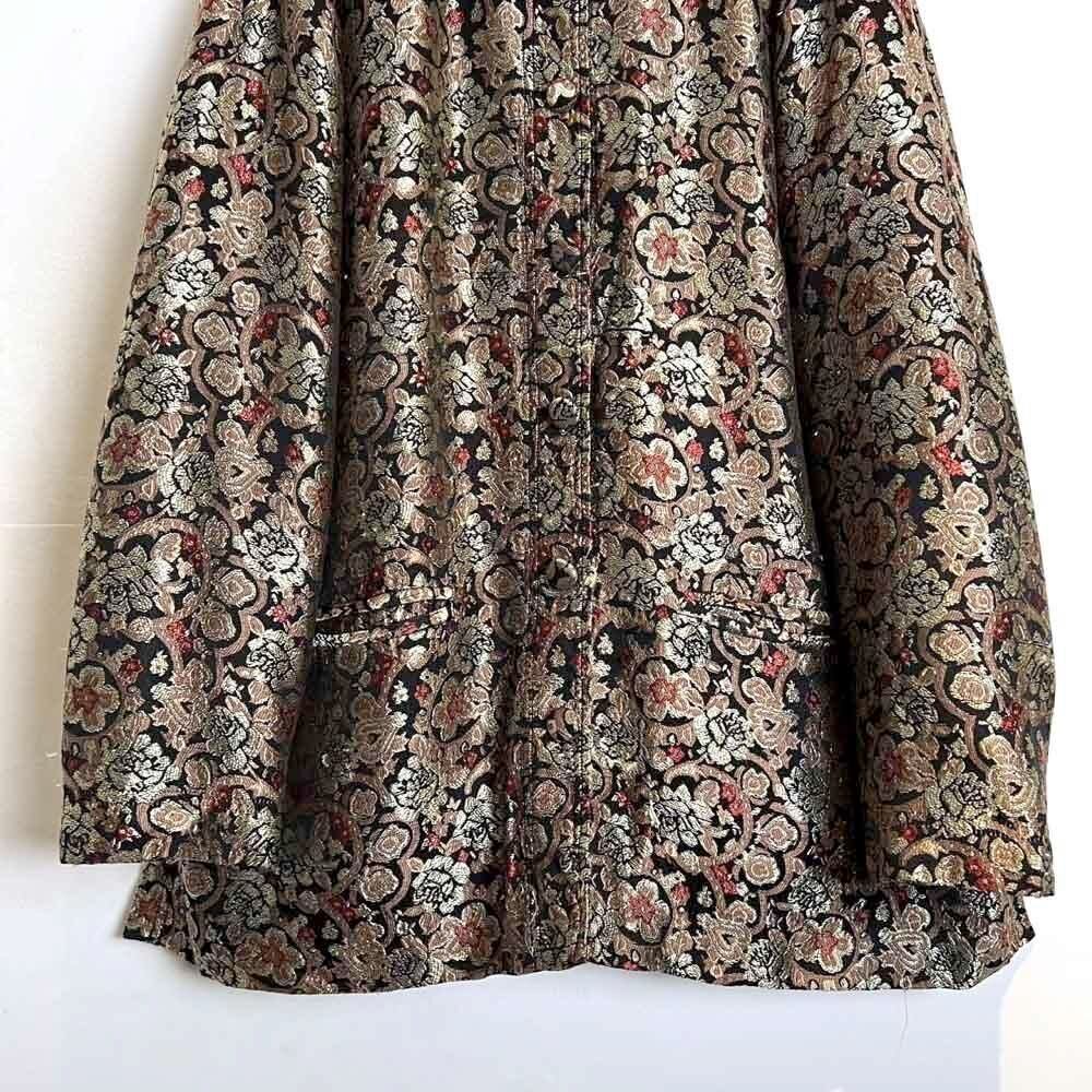 90s China collar jacquard jacket. The black, silver and brown botanical pattern creates a nice atmosphere. The glossy sheen of the silk and rayon gives this piece an erotic and gorgeous look. It has a moderately loose silhouette.