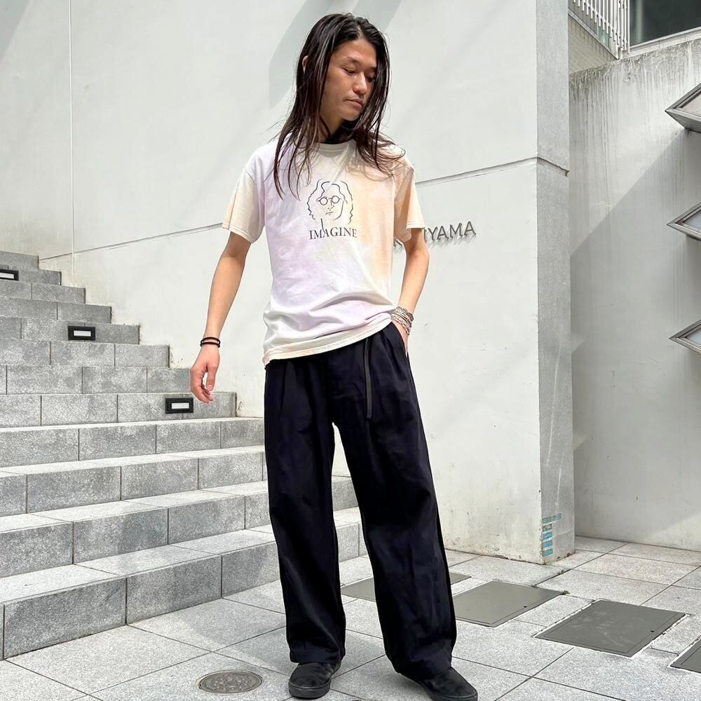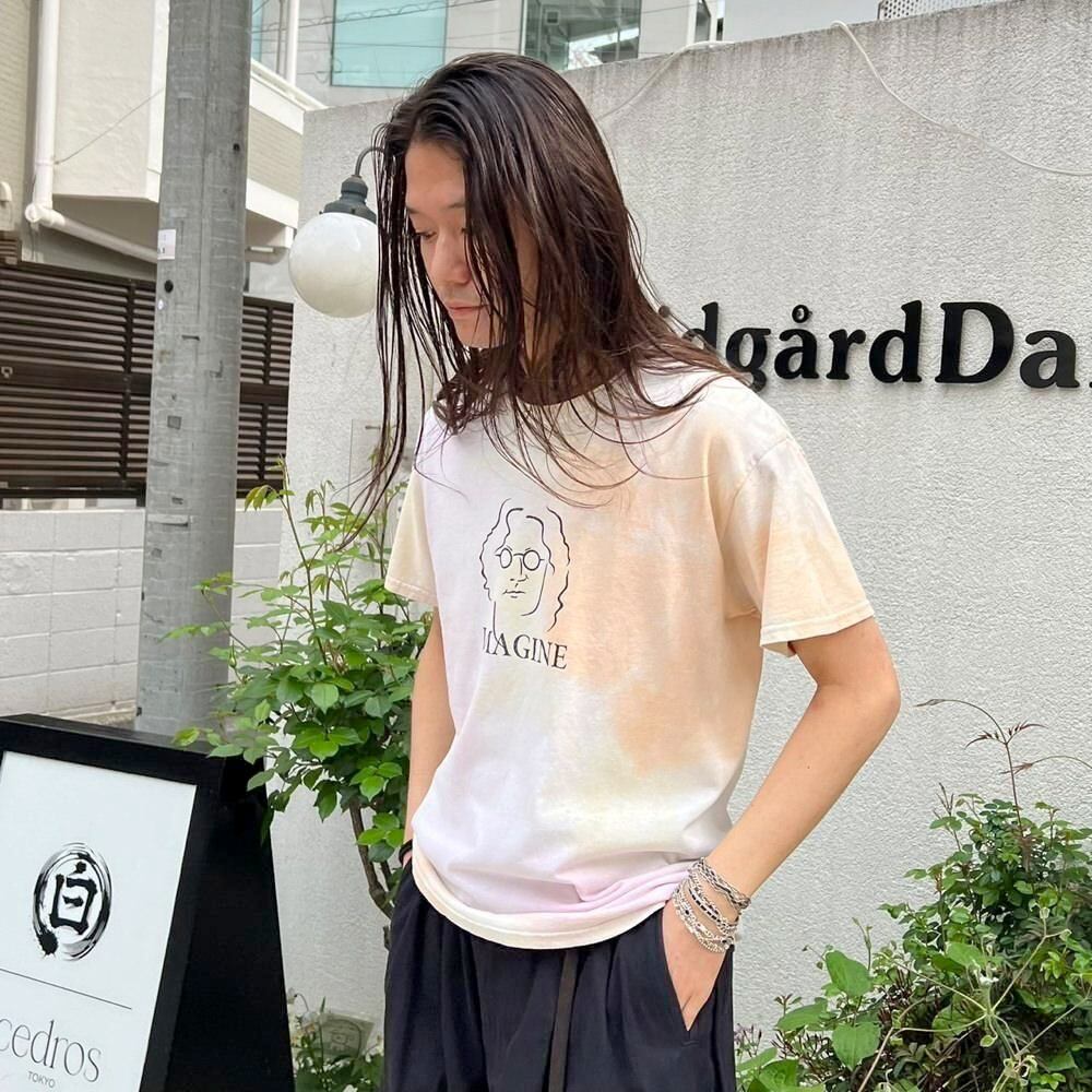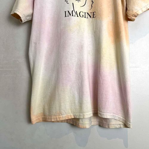John Lennons Imagine T-shirt from the 2000s. A cute piece with a simple line drawing of John on a soft, pale-colored background. The body is a Gildan M size, with a slightly slim silhouette.