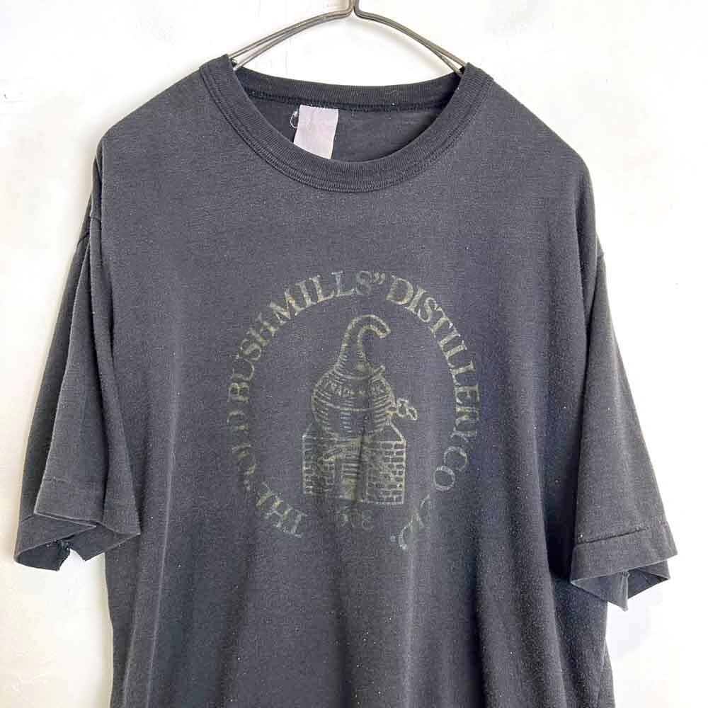 This is a promotional T-shirt from the 1980s by Old Bushmill, a Northern Irish whiskey distillery founded in 1784. It has a nice faded black color and a nice cracked print. It has a modest yet sophisticated design and a comfortable fit.