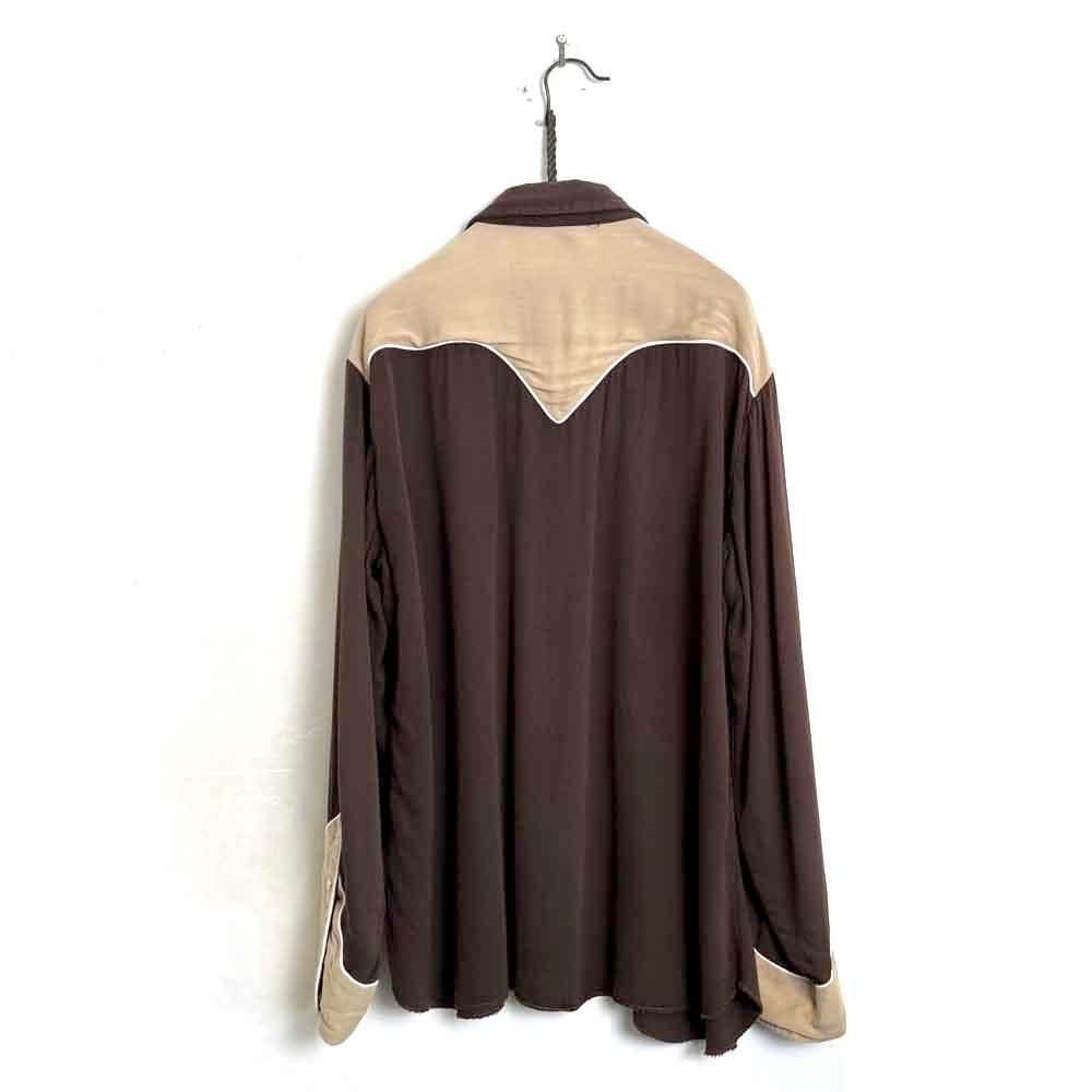 The fabric is 100% rayon and has a smooth drape. There is no size listed, but this is a loose-fitting shirt that is rare for a western shirt of this age.