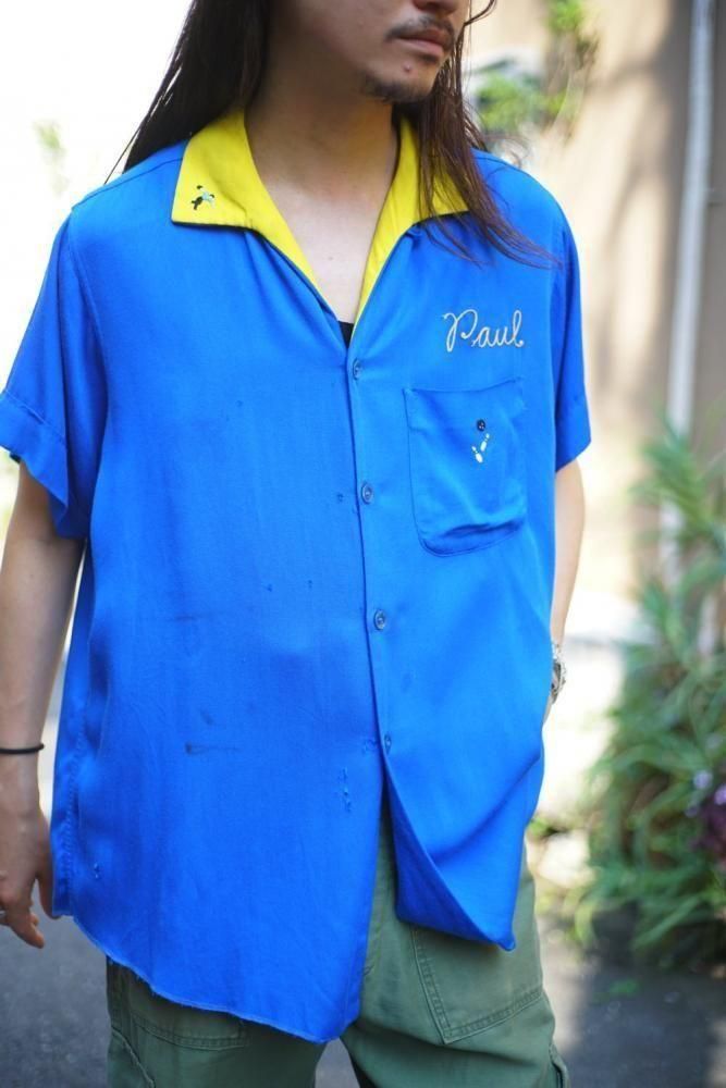 The front features embroidery unique to bowling shirts, an eye-catching bright blue body with yellow accents, and a chic Italian collar.