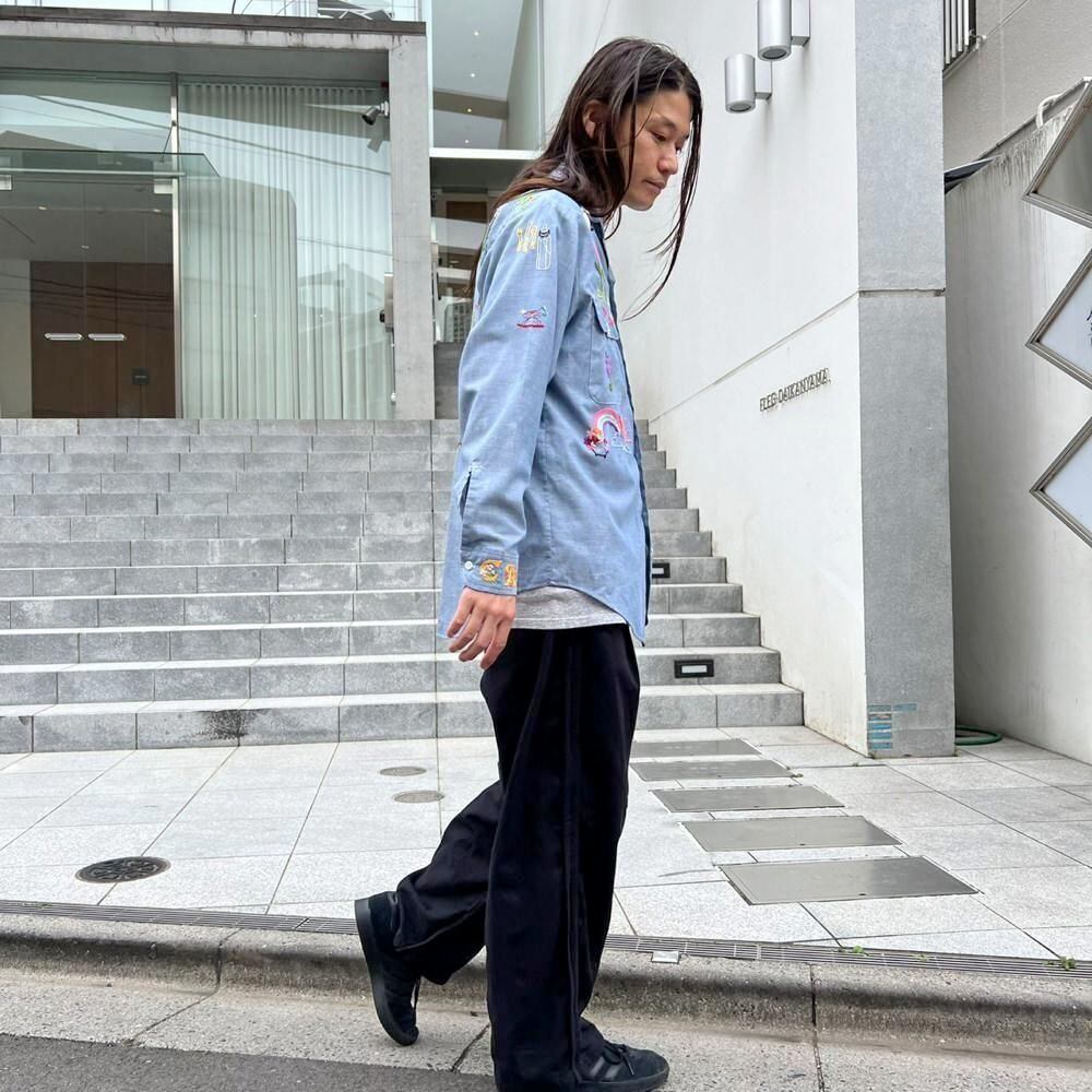 70s Big Mac hand embroidered chambray shirt. Lovely embroidery of various patterns such as flowers and animals on the body and both sleeves. A very high quality special one-of-a-kind vintage item. Relaxed silhouette with moderate roominess in the width of the body, a very good fit.