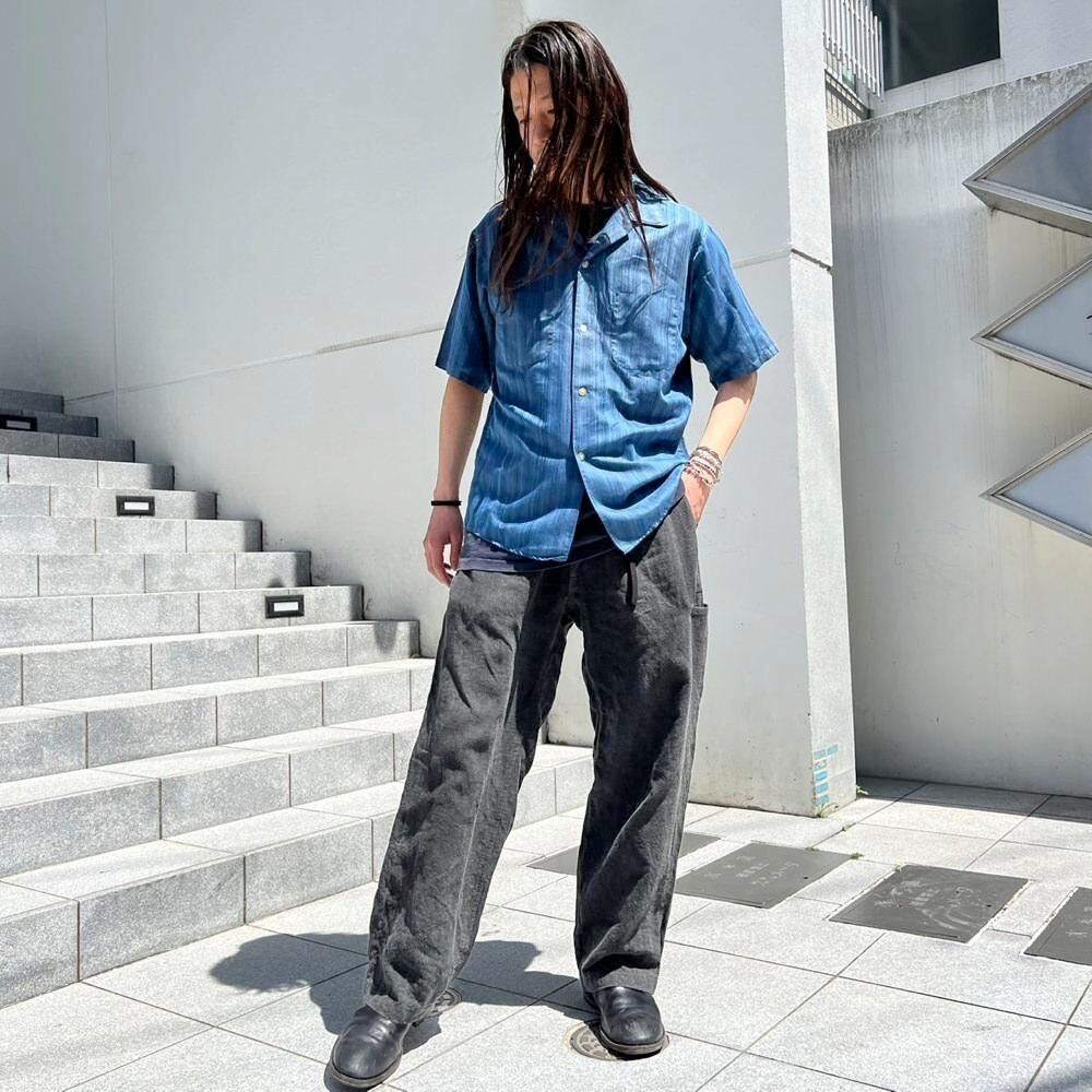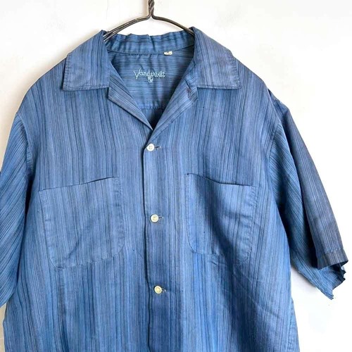 A short-sleeved shirt from the 60s. The cool and sophisticated stripes of sax blue and black create a great look. Made from a thin and light polyester fabric with a slight sheen. A neat and just-right silhouette.