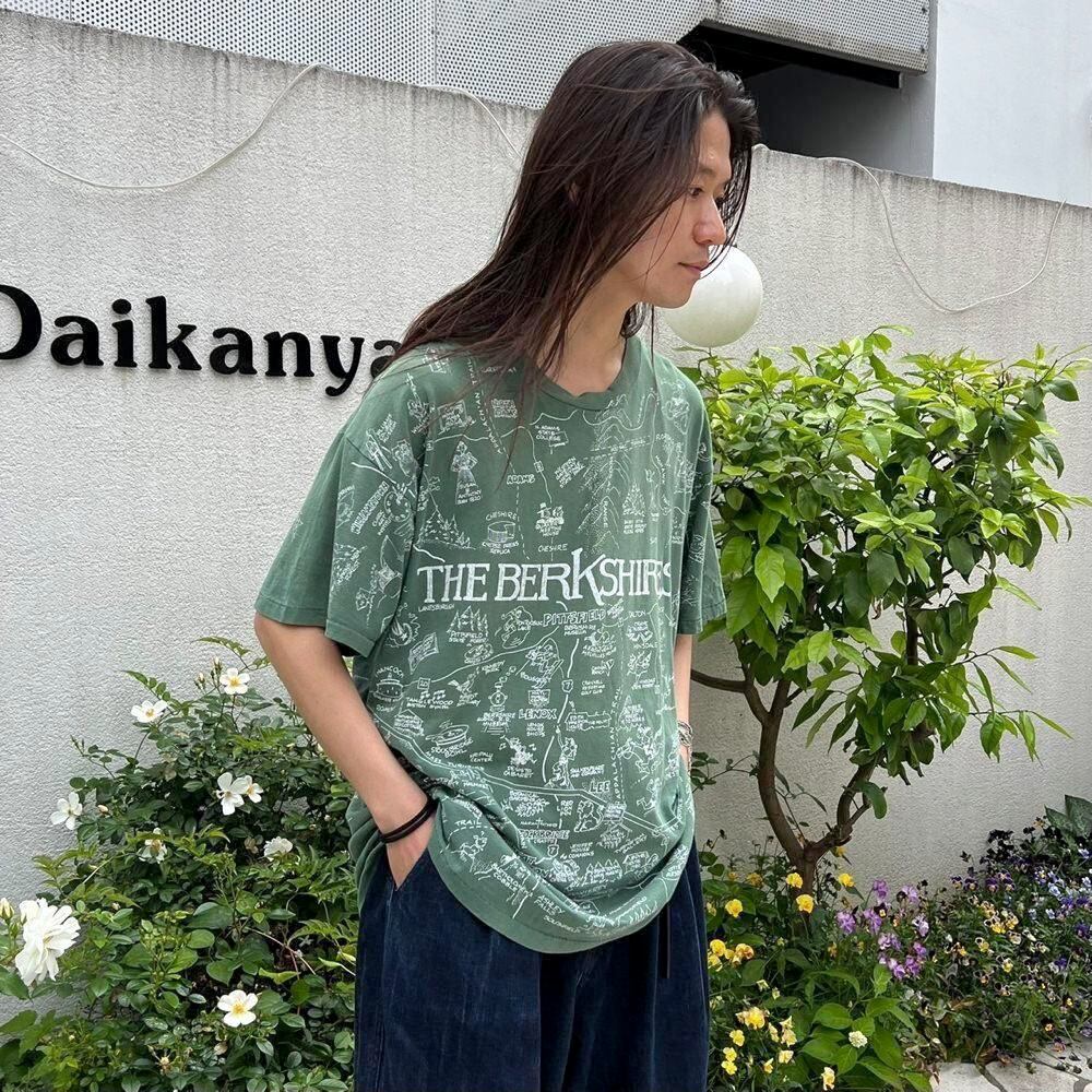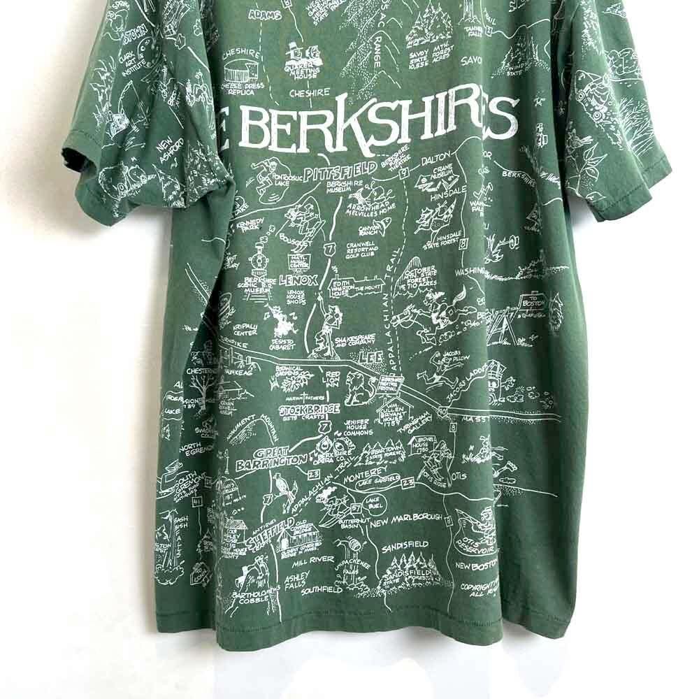 A souvenir T-shirt from the 90s from Berkshire County, Massachusetts. All-over print design with cute illustrations of Berkshires tourist spots. Faded green color with a nice texture and soft fabric. The body is a DELTA XL size, a loose oversized silhouette.