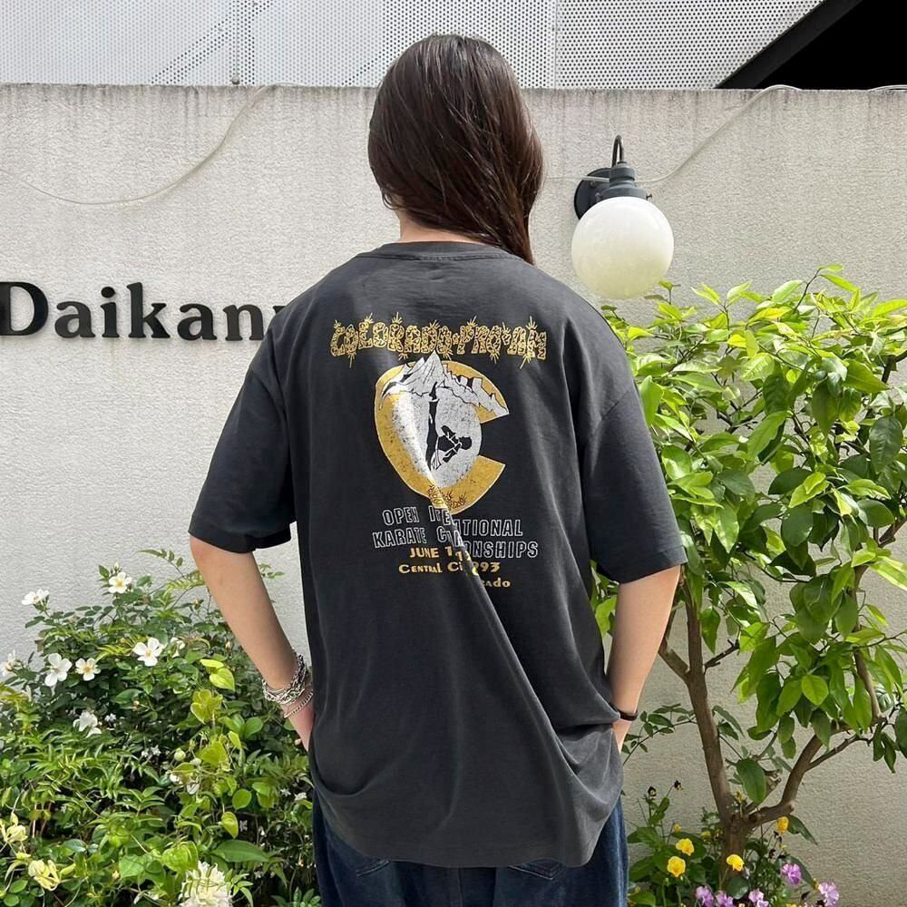 A promotional T-shirt for the 90s Karate Championship. The print on the front of the shirt is a sexy cabaret style print, but the back design is a karate tournament print, creating an interesting contrast. The print on both sides has a nice texture and cracked feel. The color is faded black with a moderate amount of color fading. The size is XL, and the width and length are well balanced, making for a good silhouette.