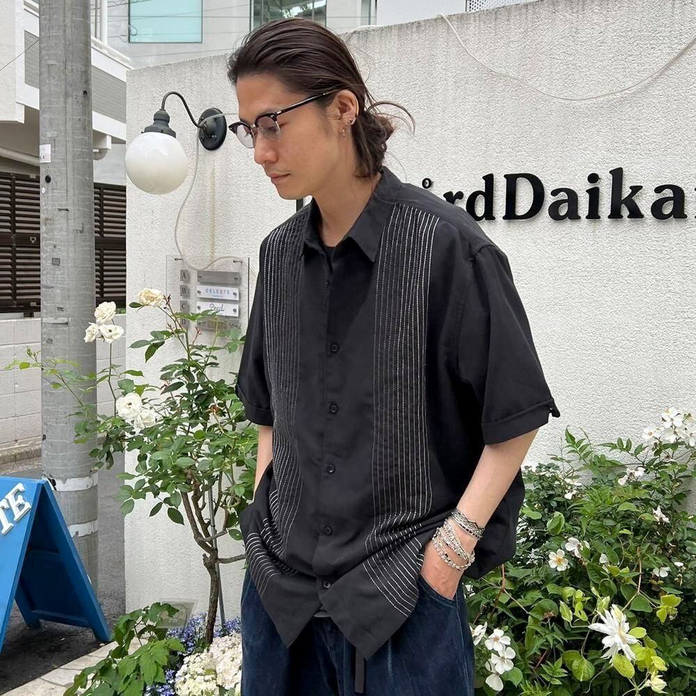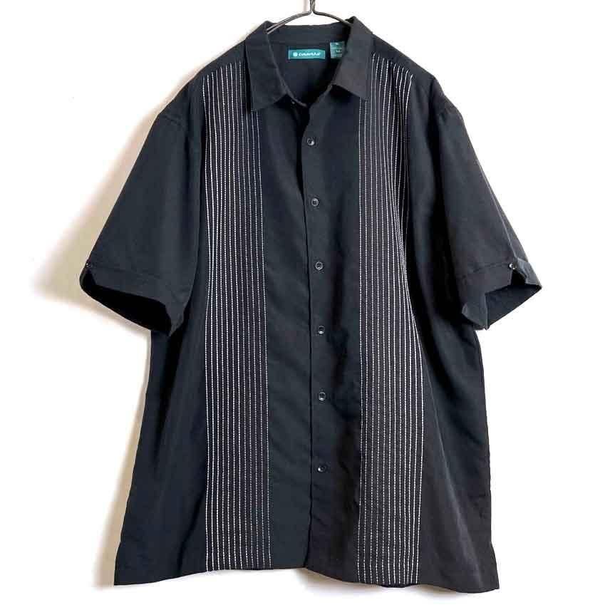 A short-sleeved Cuban shirt from the 90s. A loose-fitting black body with grey and off-white stitching stripes for a rude look. Made from a thin and light polyester fabric, perfect for summer. A loose, masculine silhouette.