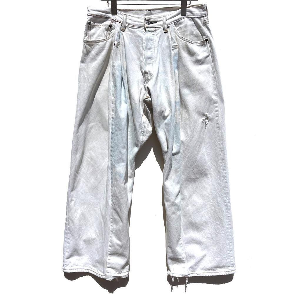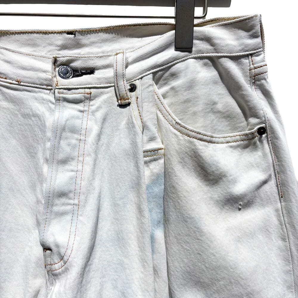 The blue denim is white bleached to create an uneven texture and a tasteful white color.