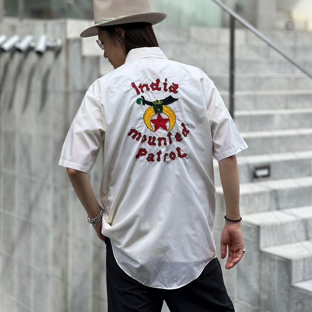 A short-sleeved western shirt from the 1980s Freemason-affiliated charity organization Shriner. The off-white color makes it easy to match with other items, and the Shriner embroidery on the body makes an impact. It has a loose fit, which is rare for a western shirt, and is made of a smooth, light cotton/polyester fabric.