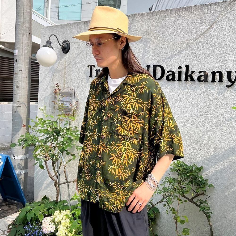 A short-sleeved rayon shirt from the 90s. The uneven green and yellow bamboo pattern gives off a Japanese vibe.