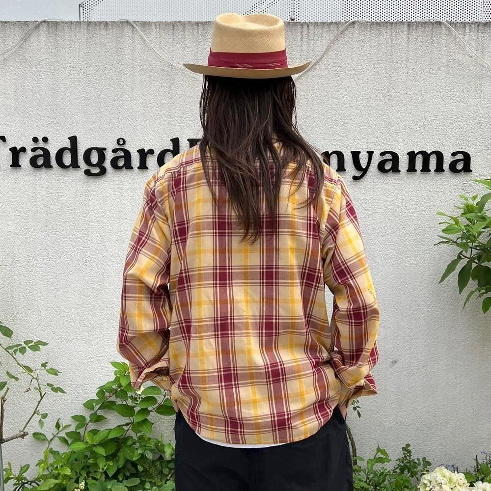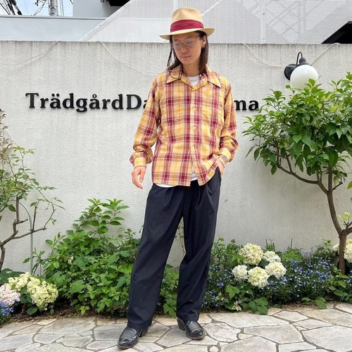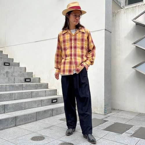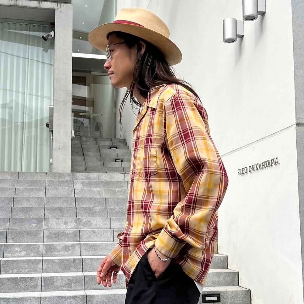 This open-collar shirt from the 70s has a nice atmosphere with a check pattern in tasteful shades of yellow and burgundy with a beige base color. It is made of a thin, smooth polyester and cotton fabric, and can be worn in the summer with the sleeves rolled up. It is a vintage shirt with a good silhouette and a moderately loose fit.