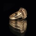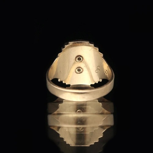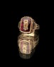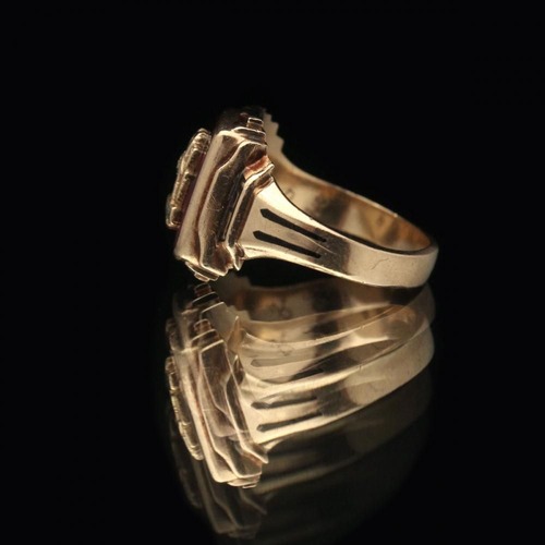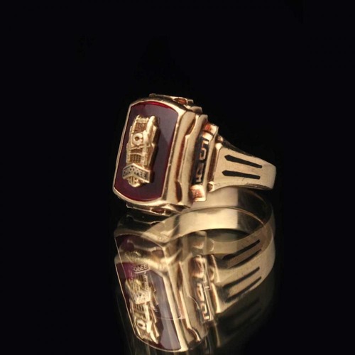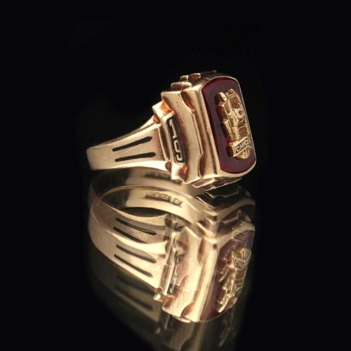 A vintage class ring from 1954. A classic and elegant design like a signet ring with a mannish square shape typical of this era and a large ruby glass. The intricately designed emblem top also gives off a sexiness that is characteristic of this item. Made by MURCHISON, 10 carat gold engraved. Please check the condition in the photos and be aware of the characteristics of vintage before purchasing.