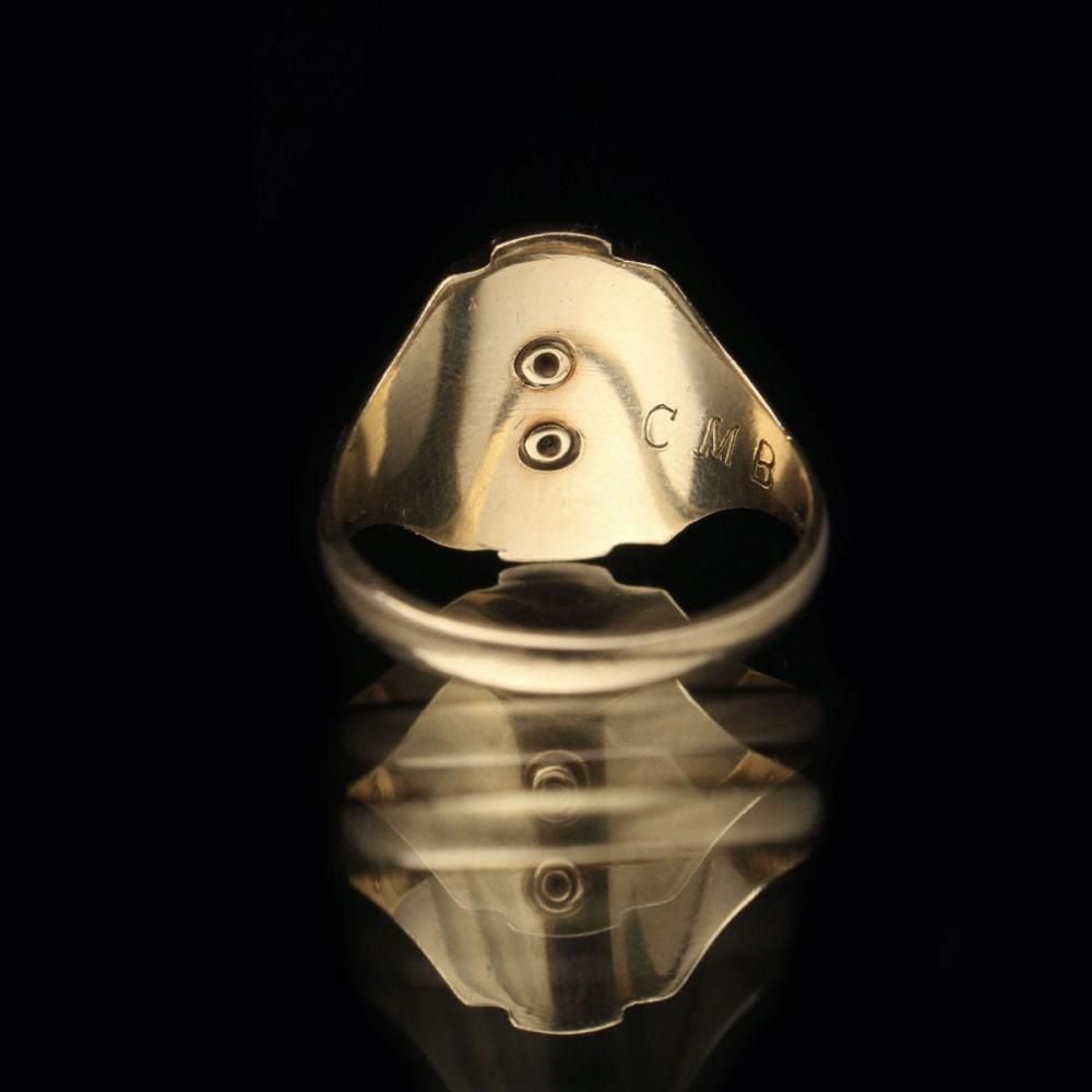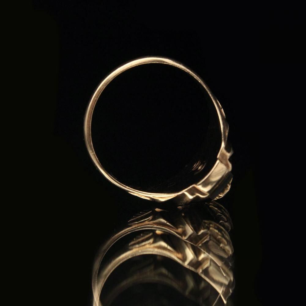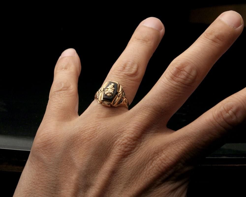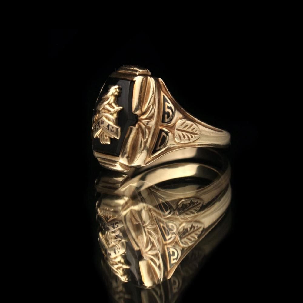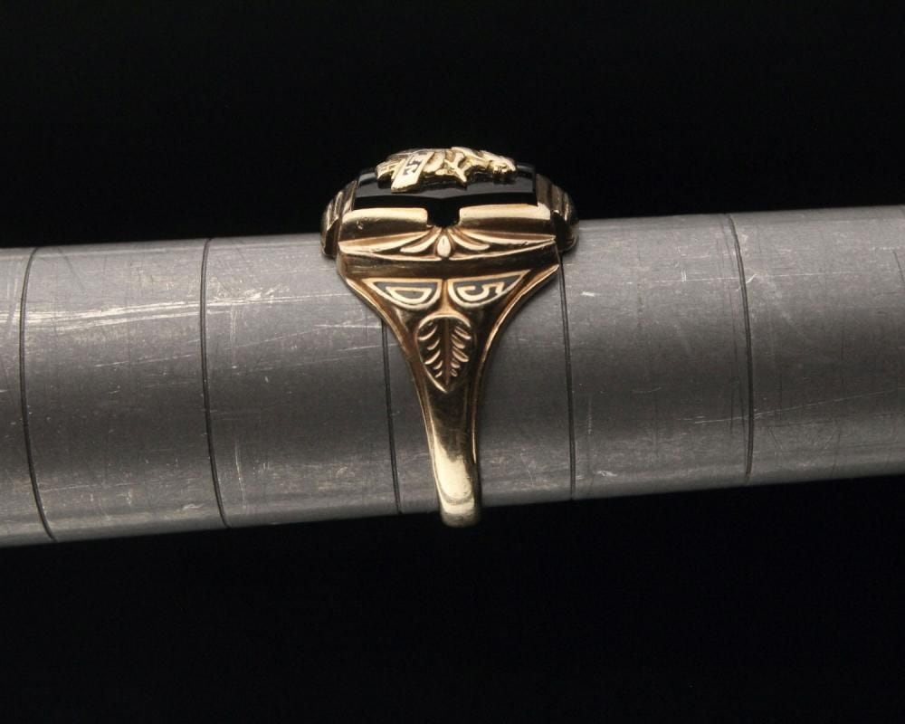 A vintage class ring from 1950. The unusual hexagonal top is decorated with onyx, creating a contrasting design. The witch motif emblem top has long been a popular design, making it an even more endearing piece. Made by MURCHISON, 10 carat gold stamped. Please check the condition in the photos and be aware of the characteristics of vintage before purchasing.
