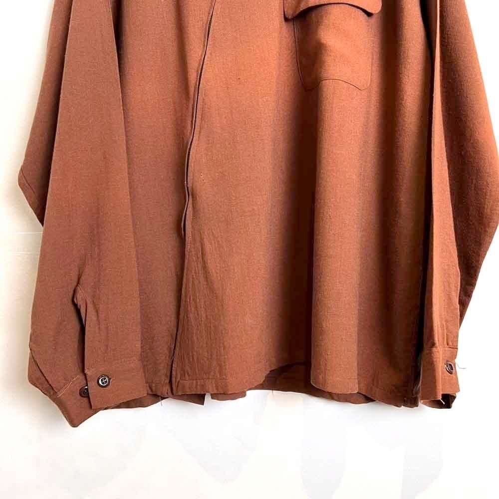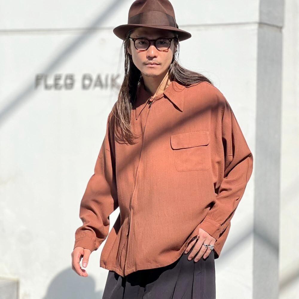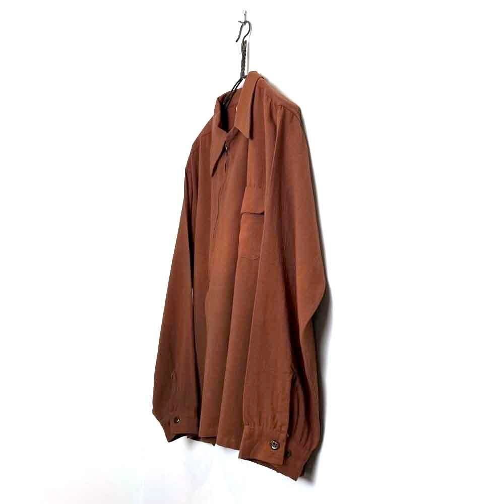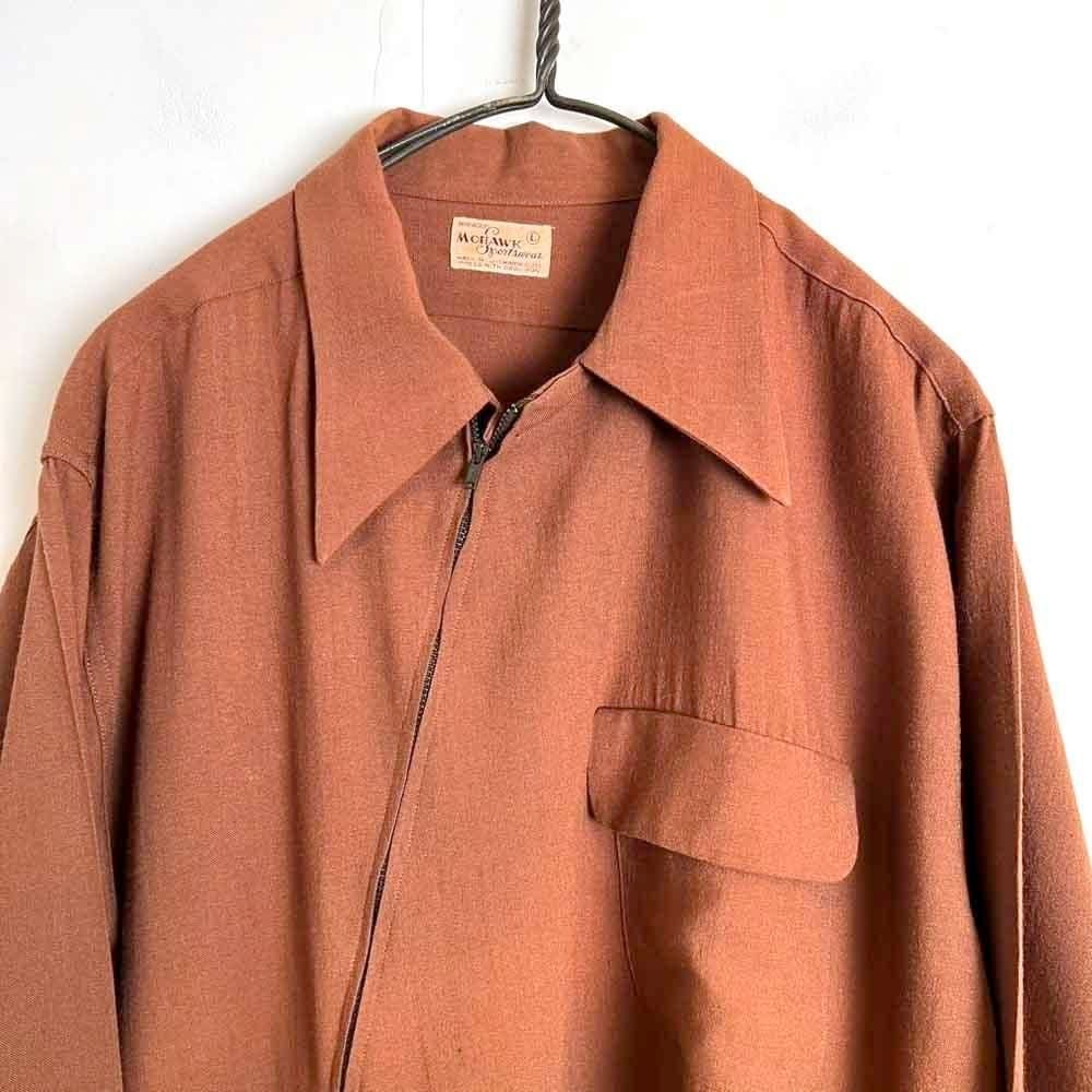 1940s Mohawk Sportswear zip-up wool shirt. The front zipper is placed diagonally, creating a cutting-edge asymmetrical design. The deep terracotta brown color also gives this piece a nice atmosphere. The 100% wool fabric is soft, fluffy, and light. The size is L, and it has a great silhouette with a relaxed fit that does not shrink.