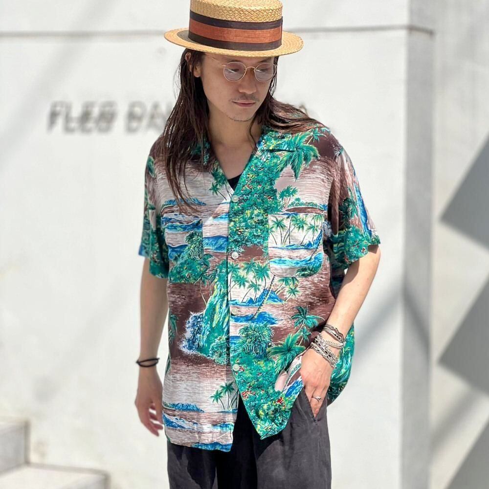 60s Penneys rayon Hawaiian shirt with a Hawaiian pattern based on green and brown.