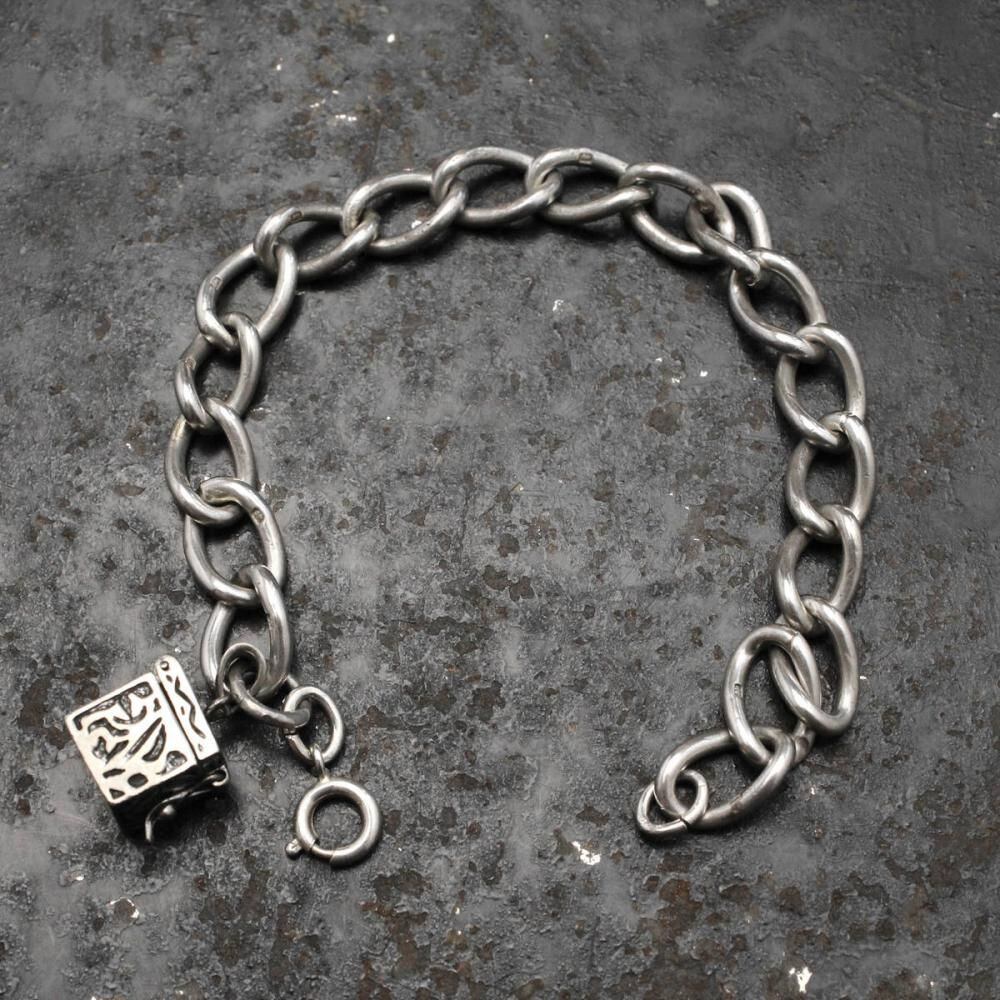 Metalworking has been popular in Bali since ancient times, and craftsmen are treated with reverence. All-handmade delicate designs, elegant motifs and constructions that combine the ethnicity unique to the area with the design brought from the continent. This is a simple yet sturdy link chain with a minimalist and mannish feel, and a playful design with an opening and closing box as a charm. The design and engraving indicate that it is made in Bali and is engraved with silver. As it is an old item, there are scratches, etc. Please check the photos and understand the characteristics of vintage items before purchasing.