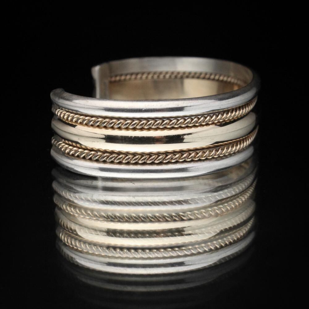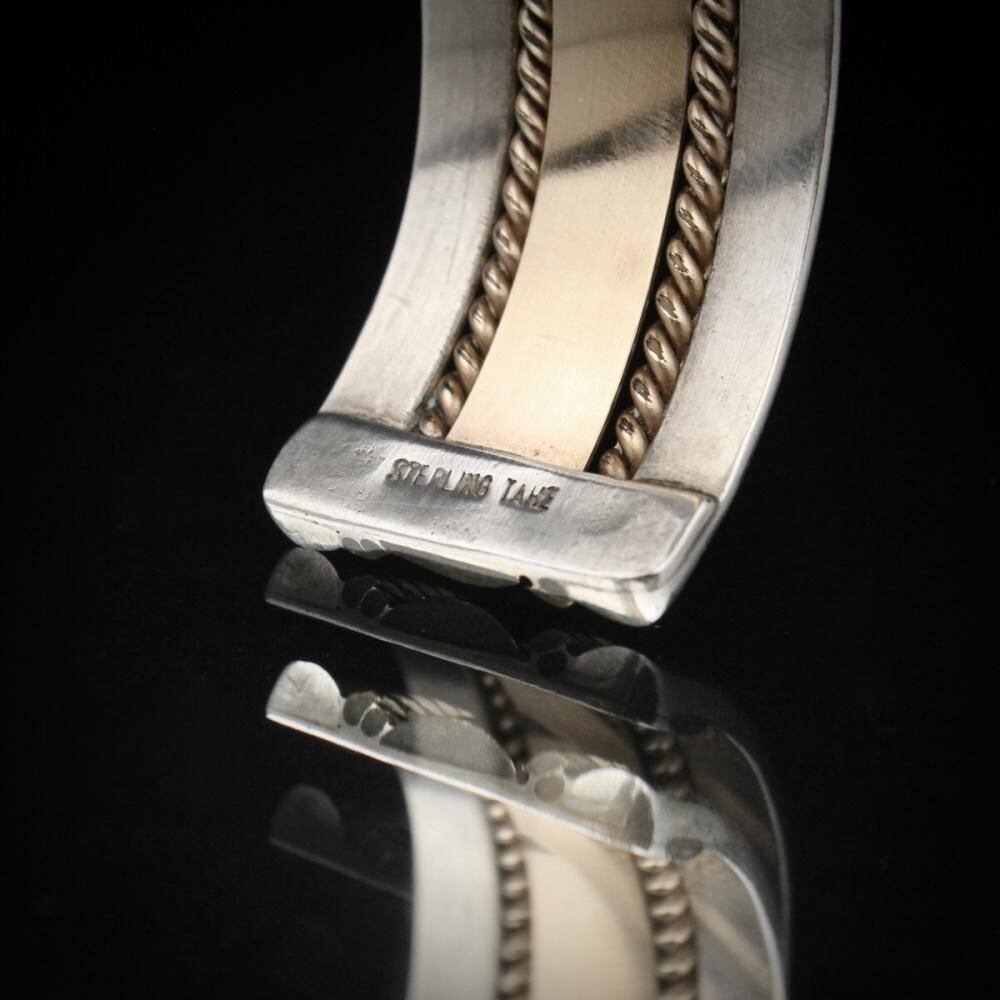 A bangle by Navajo artist Franklin Varna and his wife Tahe. Since the 1980s, the family has continued to make Tahes works, and their signature wire design is a distinctive feature. This piece has a heavy, wide silhouette with gold-plated parts inserted into it, giving it a mannish yet elegant look. Engraved with TAHE-STERLING. As it is an old item, there are scratches, etc. Please check the photos and understand the characteristics of vintage items before purchasing.