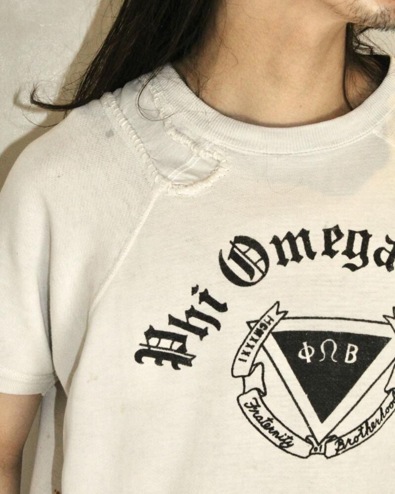 A short-sleeved cotton sweatshirt from the 1960s. The aged white body has a nice atmosphere and a rare double-sided print, especially the print on the back. This sweatshirt from this era is mostly small, but this is a rare, roomy, well-balanced size of about L to XL. Since it is an old item, there may be some aging. Please check the photos and understand the characteristics of vintage items before purchasing.