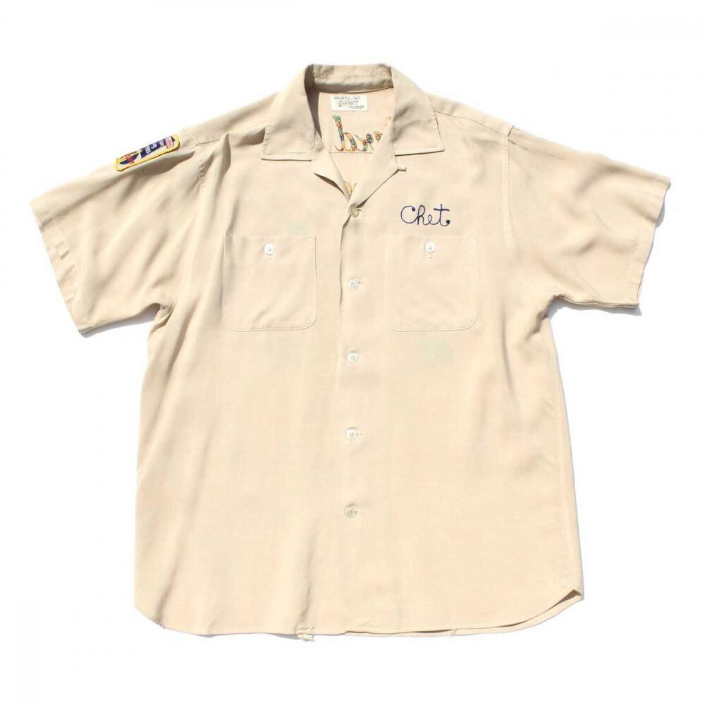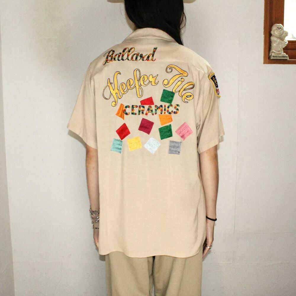 A bowling shirt from the late 1950s. The dark beige color of the elegant rayon body has a smooth texture. The stunning embroidery on the back is a valuable piece with an elaborate colorful design unique to a tile shop. It is probably a size L with a moderately loose silhouette. Since it is an old item, there may be some aging. Please check the photos and be aware of the characteristics of vintage items before purchasing.