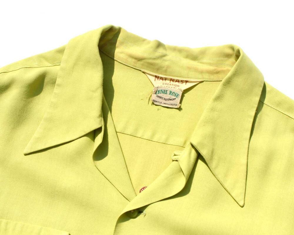 A rare long-sleeved bowling shirt made until the 1950s. Made of medium-weight rayon, it has a smooth, drapey look. The vague and unique lime yellow neon color is typical of this era, and the shirt is in good condition, making it even more impressive. The wine-colored flooring company embroidery adds to the sophistication. The very large size, which is rarely seen in vintage items, and the shirt cut give it a more relaxed silhouette. Since it is an old item, there may be some aging. Please check the photos and be aware of the characteristics of vintage items before purchasing.