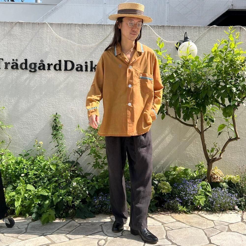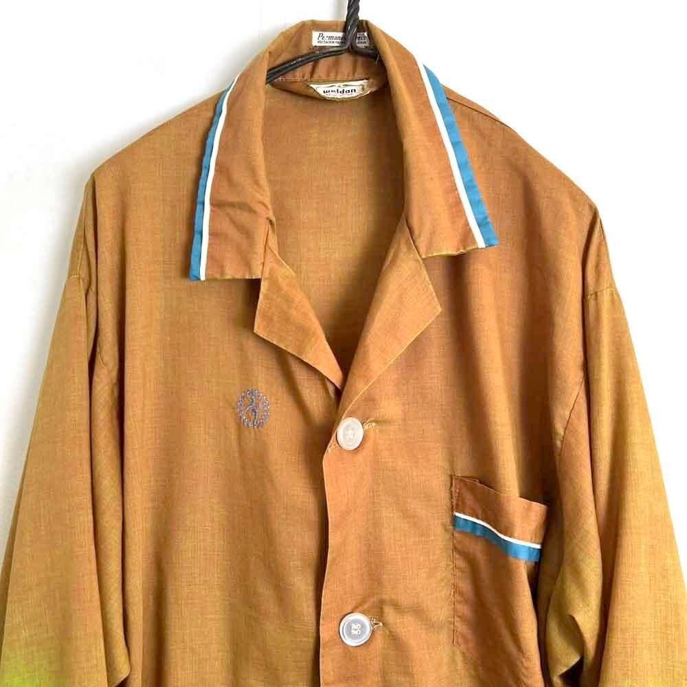 A pajama shirt from the 60s. The khaki orange x light green color scheme of the chambray fabric creates a nice atmosphere. The thin sleeves have faded to light green, creating an interesting look with aging. The soft and smooth polyester x cotton fabric makes this a comfortable piece to wear. The loose fit gives it plenty of room in the width of the body.