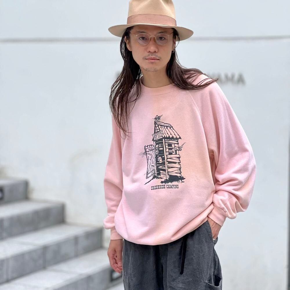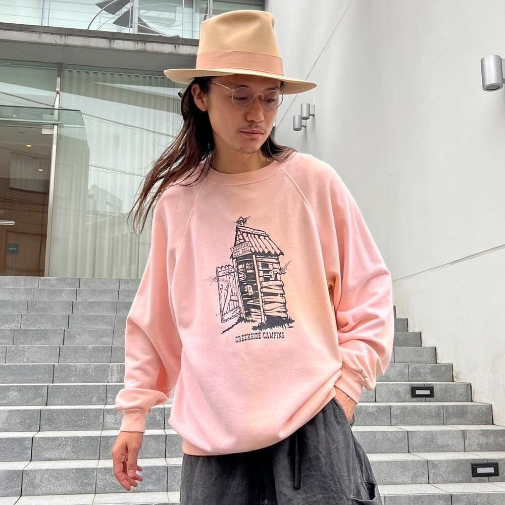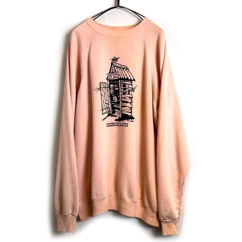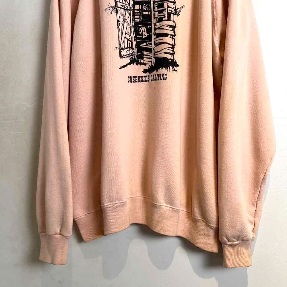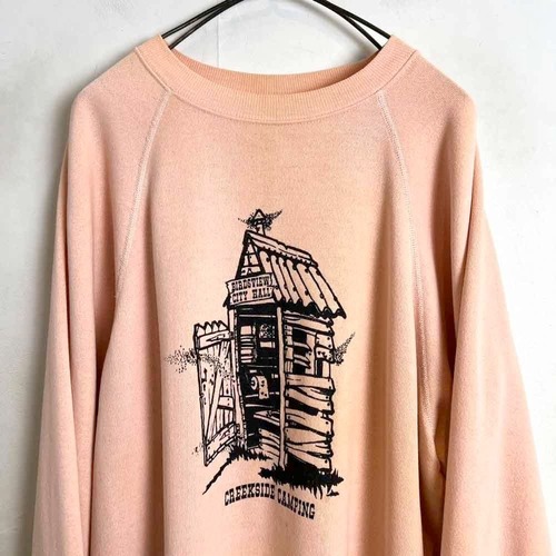 80s Creekside Camping souvenir sweatshirt. The contrast between the elegant pale pink body and the print of a toilet with flies in it is an interesting piece.