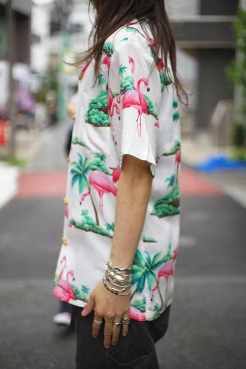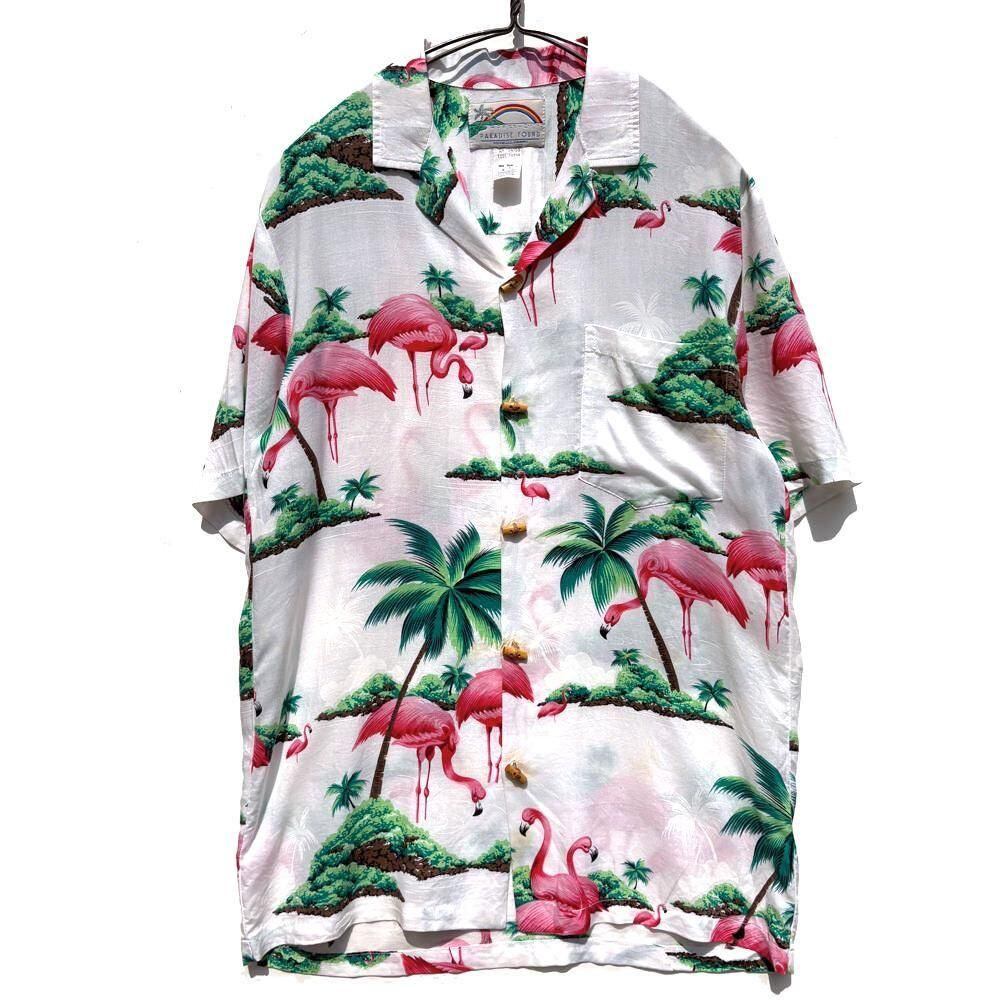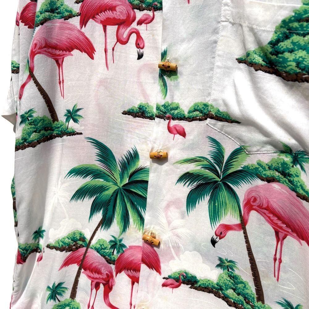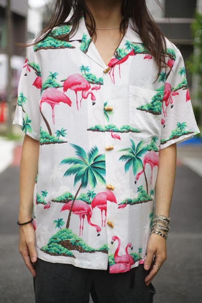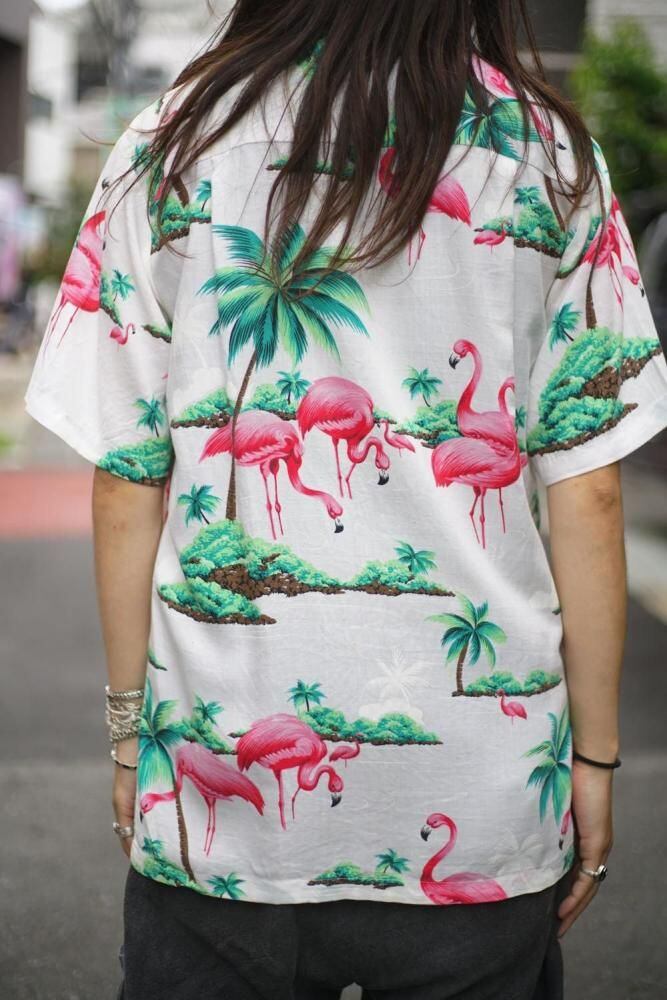The flamingo design, which is rare on an aloha shirt, gives it a nice atmosphere, and the contrasting colors give it a sexy look.