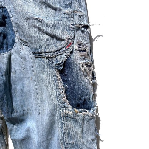The fabric has softened over the years, giving it a light texture, and the indigo has retained its color and a nice crease, making it a special piece with a unique presence and an artistic look with damage and repair marks.