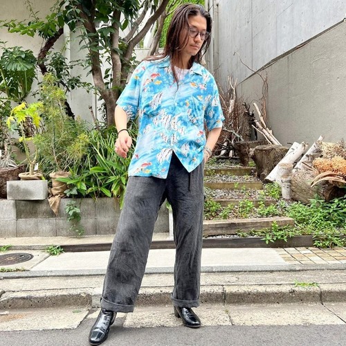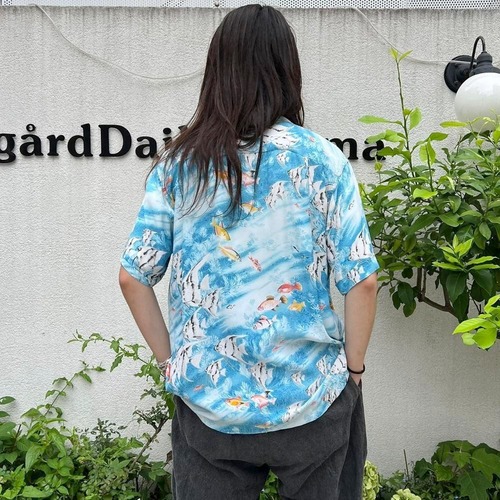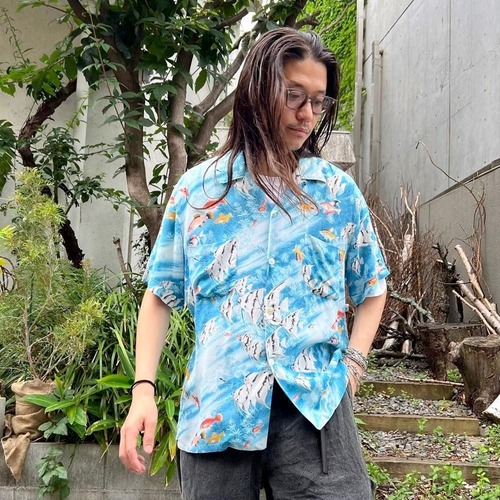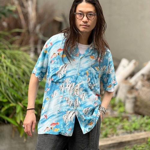 60s Penneys rayon Hawaiian shirt with a cool blue color and colorful tropical fish prints.