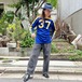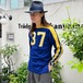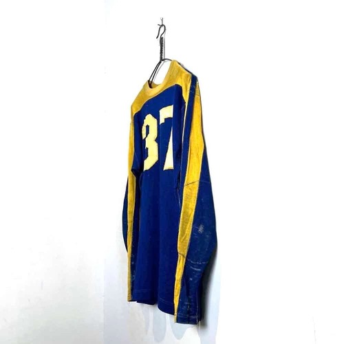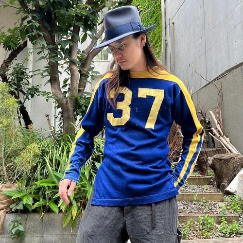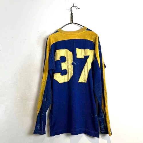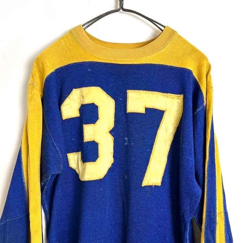A football shirt from the 1950s. The fabric has some wear and dirt due to aging, giving it a tasteful blue and yellow two-tone color. The fabric is soft and glossy, made of rayon and cotton. It has a slim silhouette that is typical of football shirts from the old days.