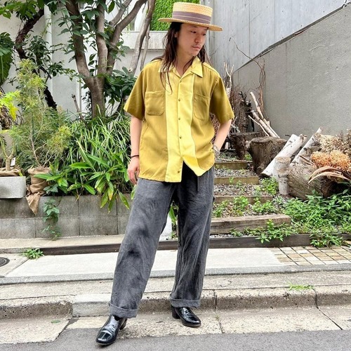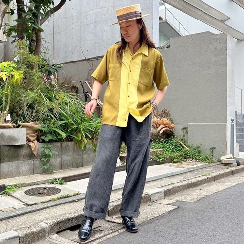 A short-sleeved loop-collar shirt from the 60s. The two-tone earthy khaki and pale yellow colors are a nice touch. The rayon x polyester fabric is soft yet firm, and it can be washed without worrying about shrinkage, unlike 100% rayon fabric. The size is M, but the width of the body is just right, making it a good fit.