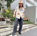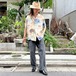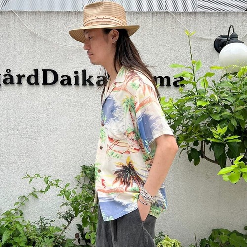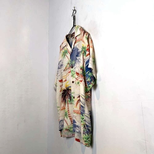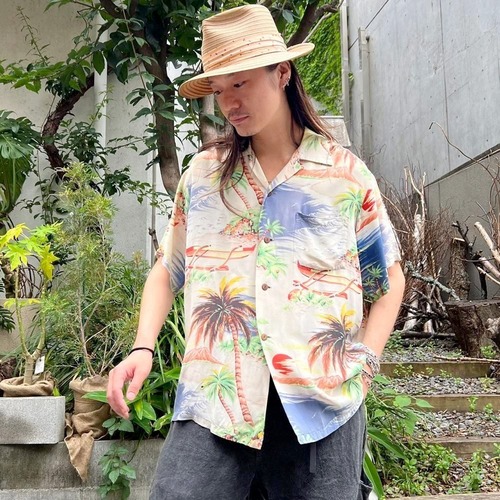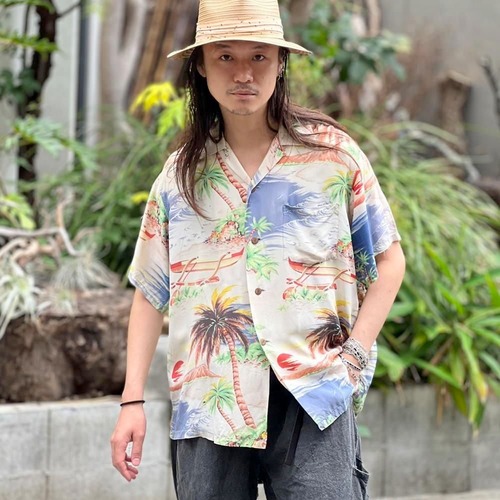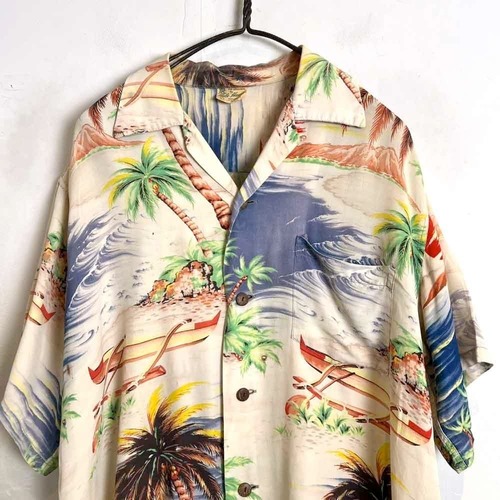 A rayon Hawaiian shirt from the 1940s. The pale Hawaiian pattern has faded over the years, giving it a very nice feel.