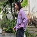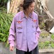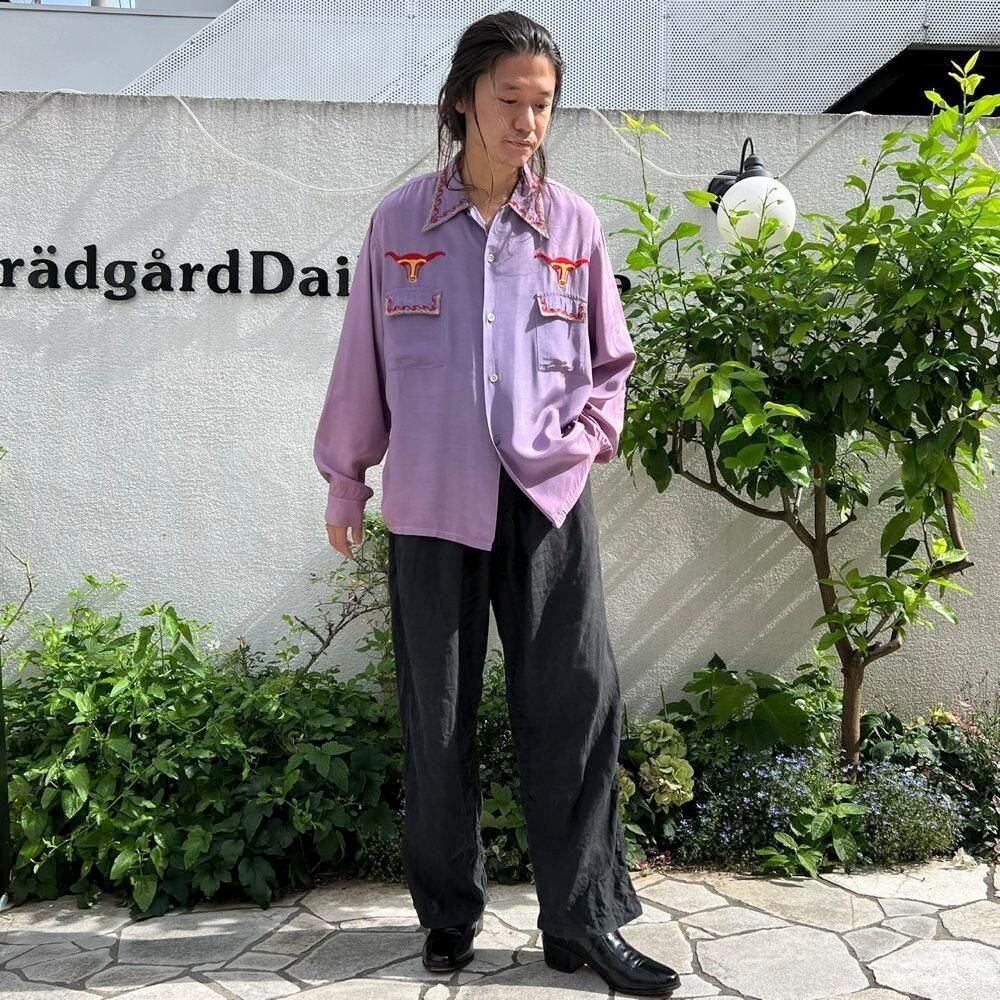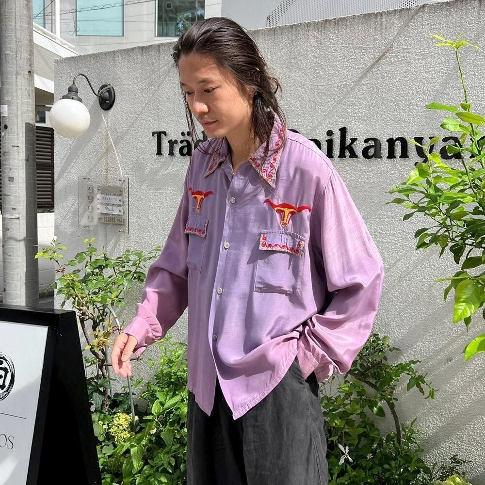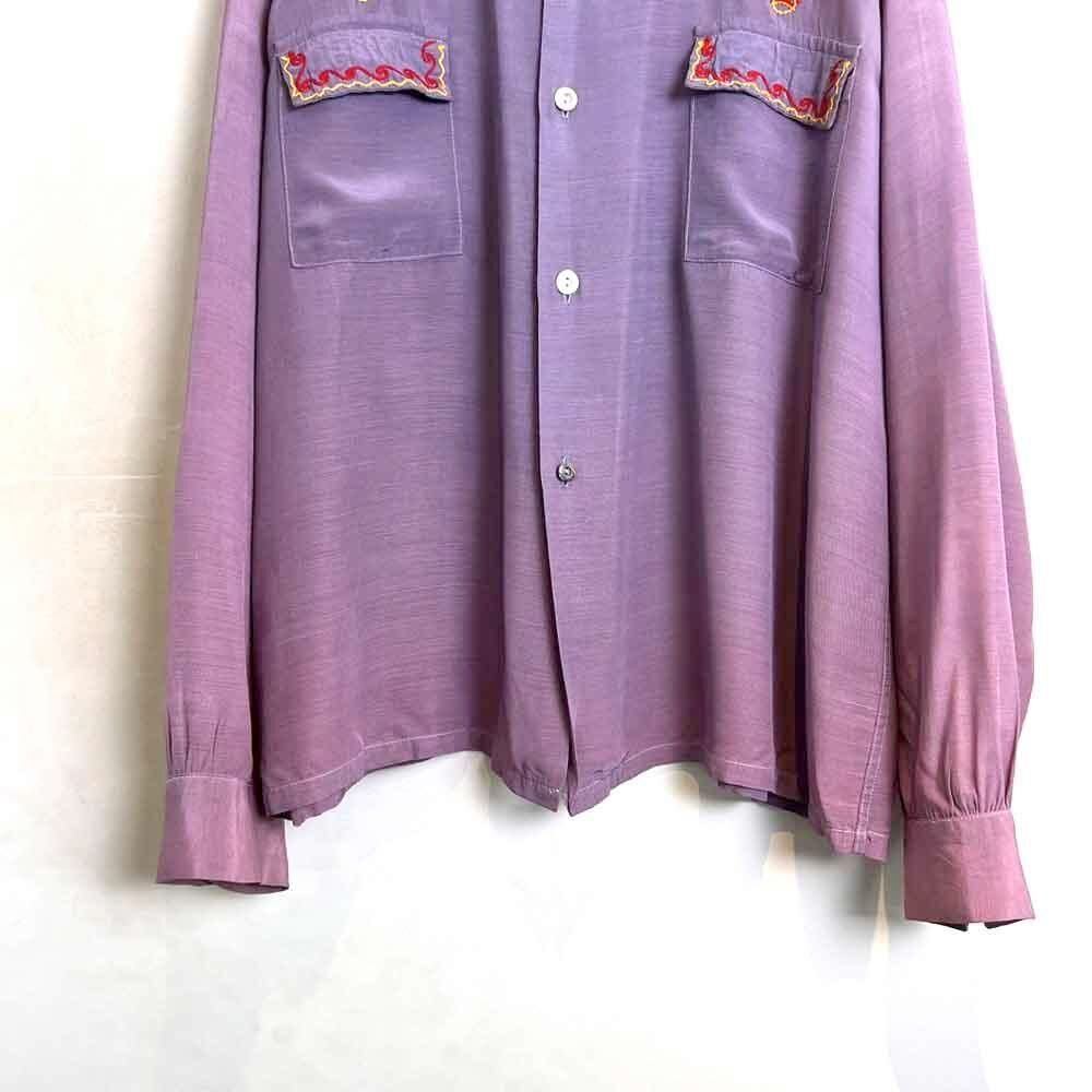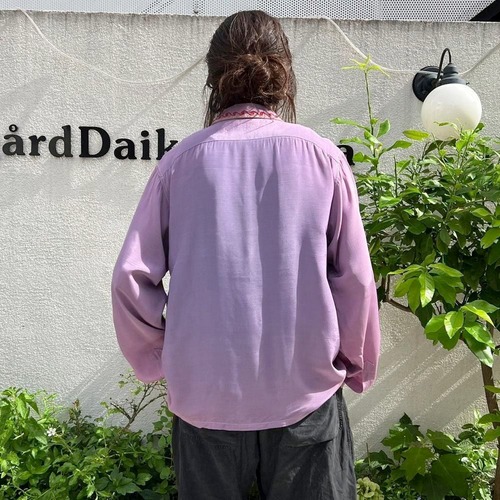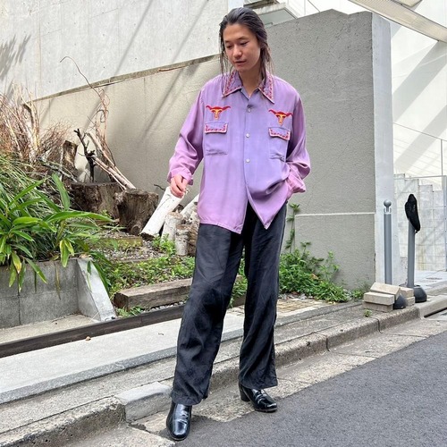 A 40s open-collar rayon shirt. Pale purple color with uneven fading and a nice texture. Western-style embroidery gives it a nice feel. A moderately loose box silhouette that is rare for a Western-design shirt. 100% rayon satin fabric that drapes smoothly like silk.