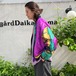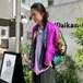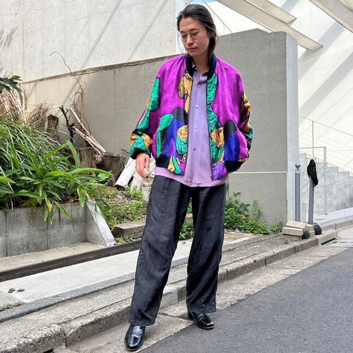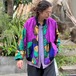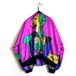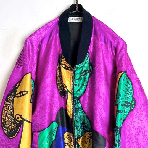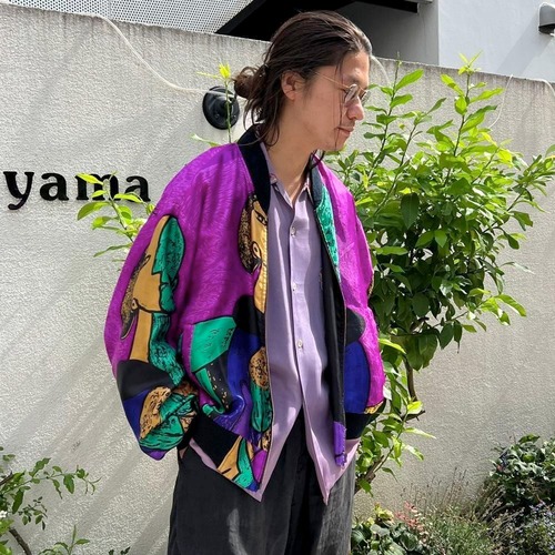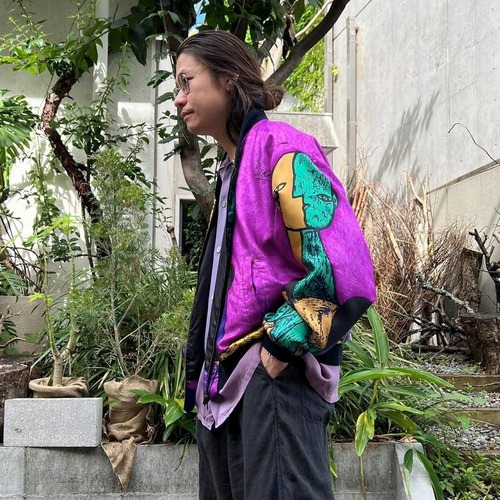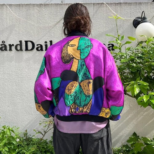 80s Picasso Art Pattern Jacket. The contrast of purple and green creates a striking image. The silhouette is short and relaxed, creating a perfect balance. Made of light polyester satin fabric, this light outerwear piece can be worn easily.
