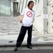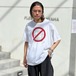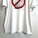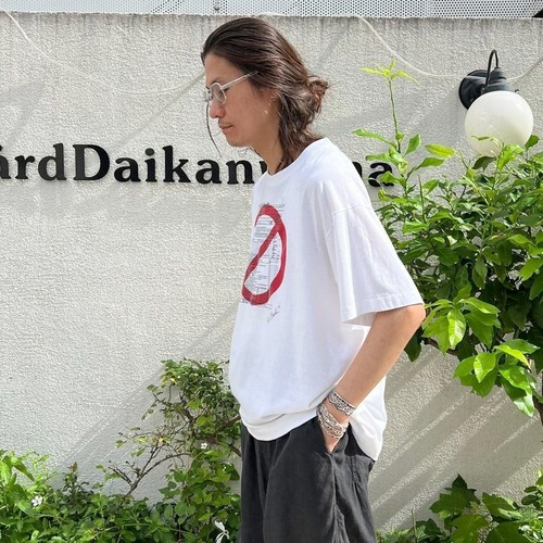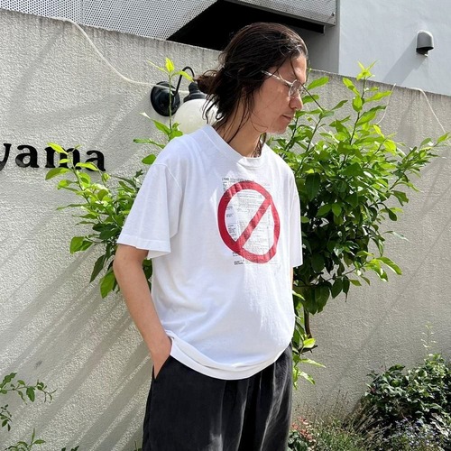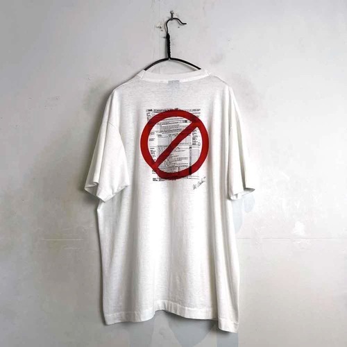 A 90s double-sided print T-shirt with a surreal design featuring a road closure sign reminiscent of Ghostbusters printed on an American income tax return. A comfortable fit with just the right amount of room.