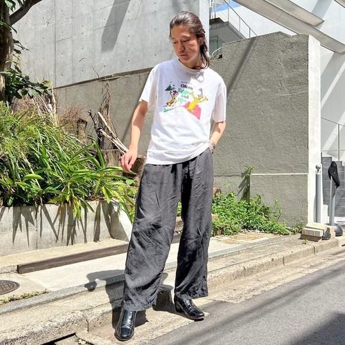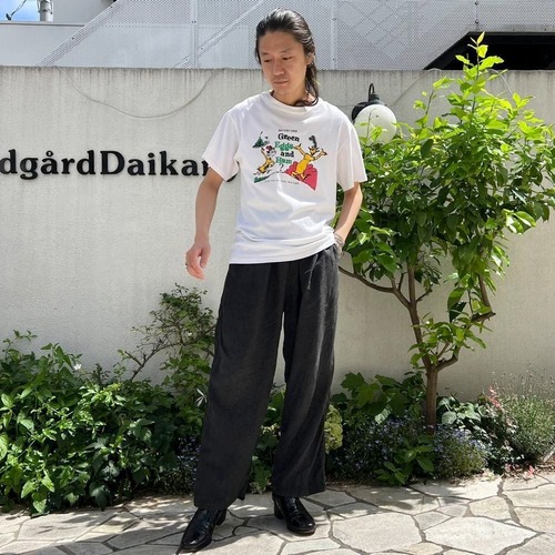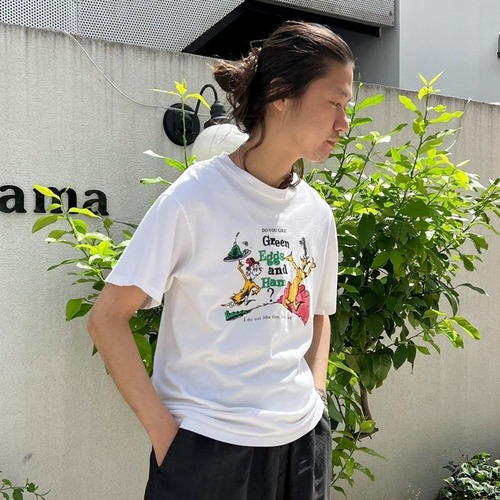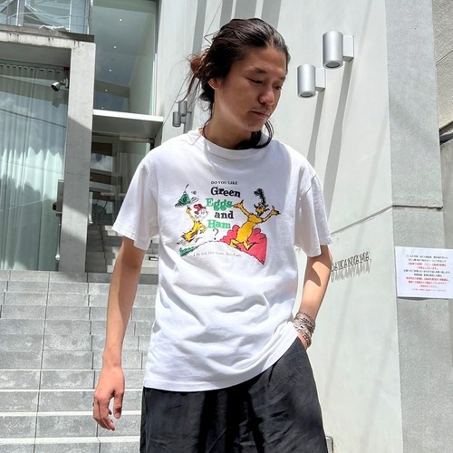 A 90s print T-shirt featuring Green Eggs and Ham, one of the masterpieces by Dr. Seuss, an American picture book author famous for The Grinch. A cute piece with comical characters and pop colors. Just the right size for a clean look.