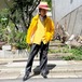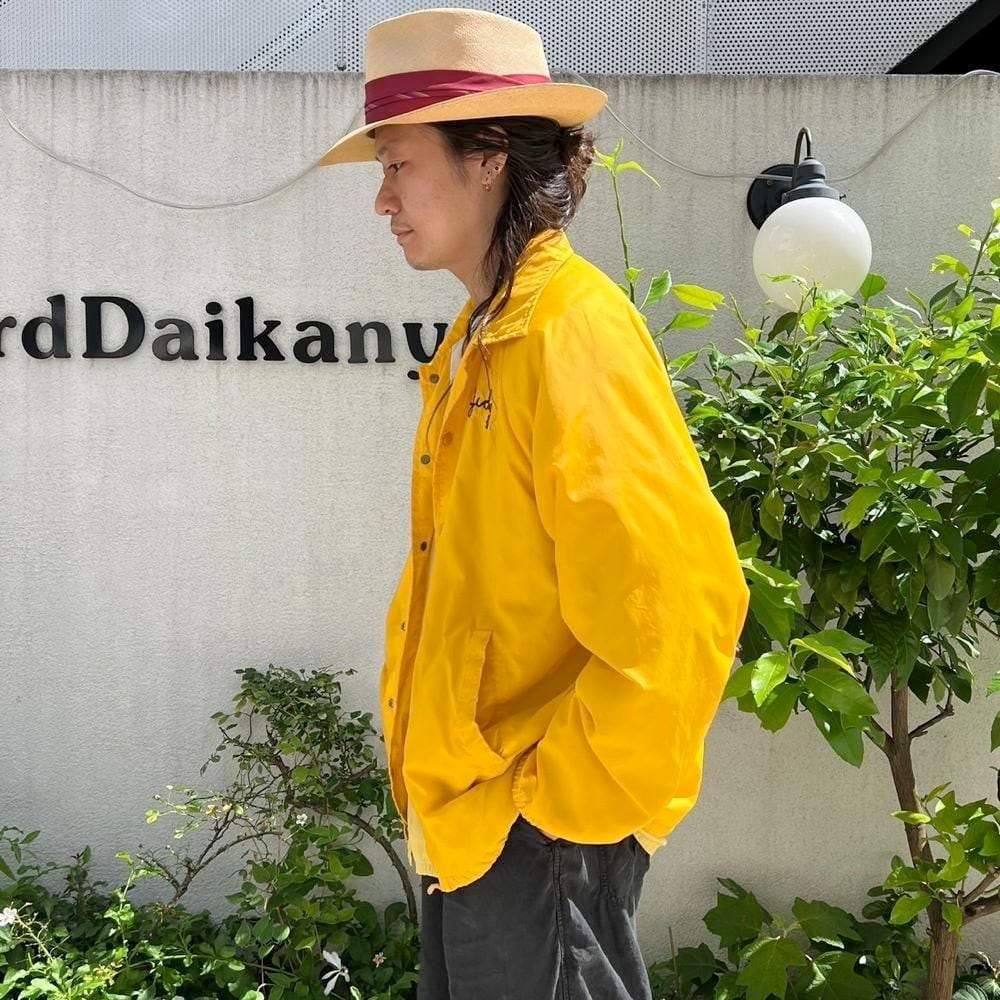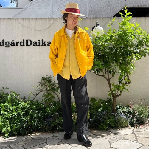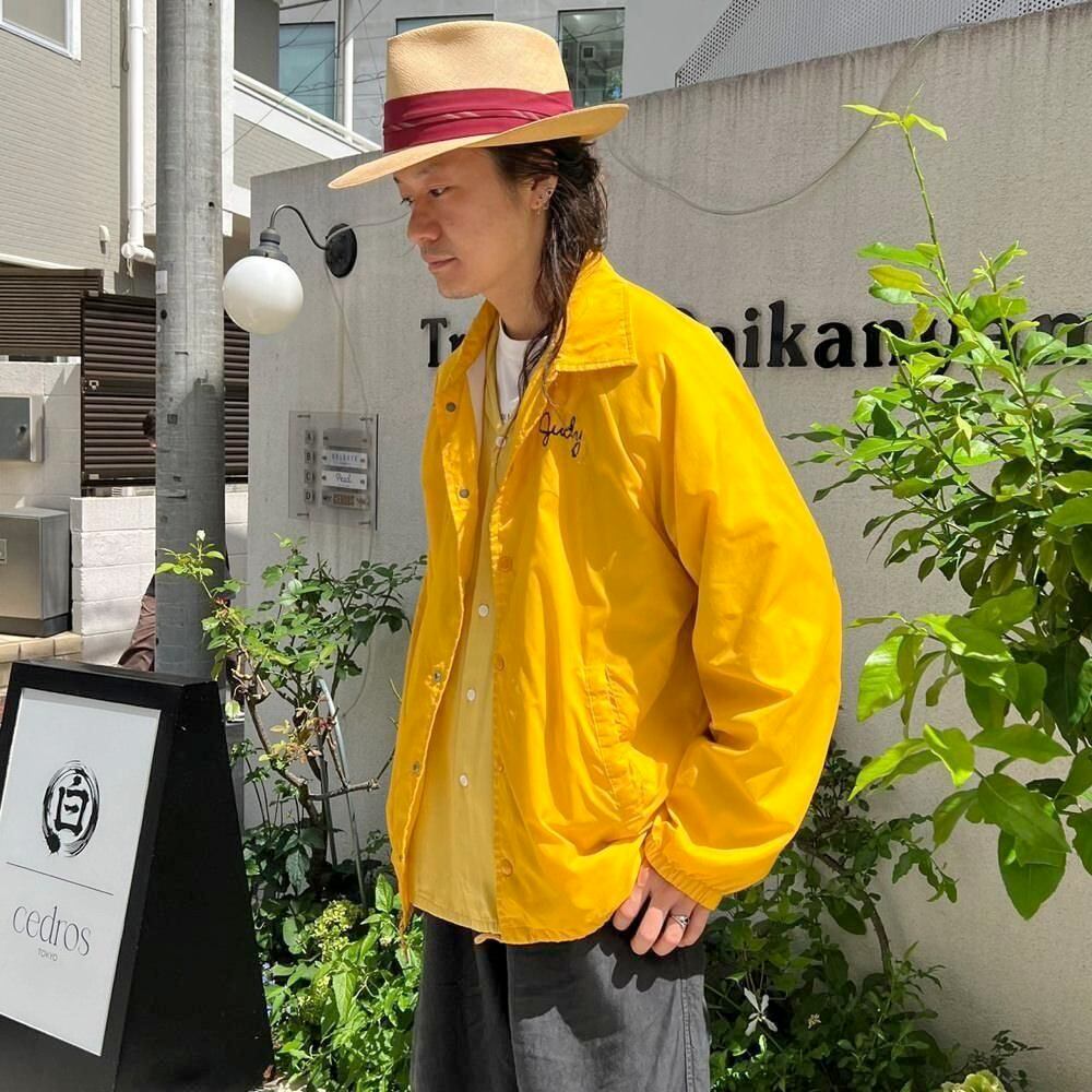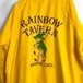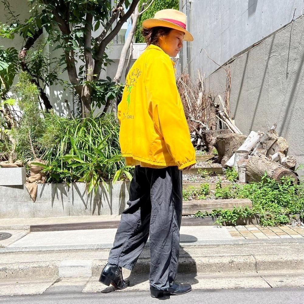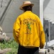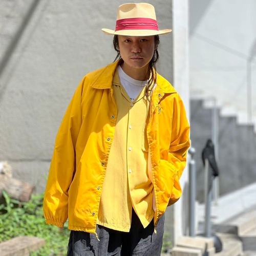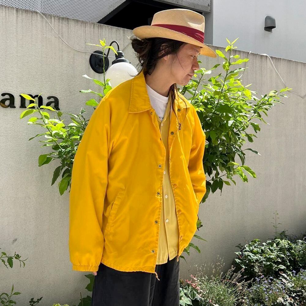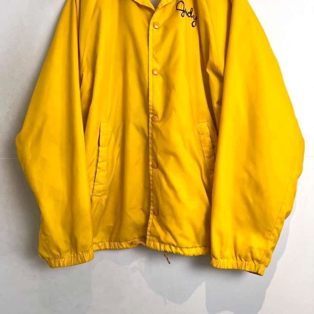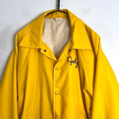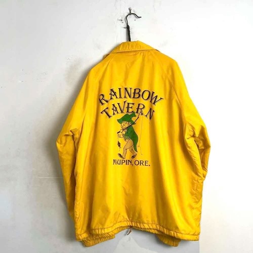 This 80s coach jacket is from the Rainbow Tavern pub in Maupin, Oregon. It has a bright yellow color, embroidered name on the chest, and a cute back print. It has a good silhouette and a roomy fit. Its made of lightweight nylon material, so its a light outerwear piece that you can easily put on.