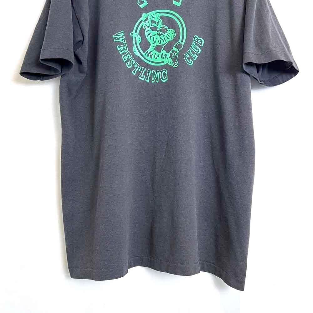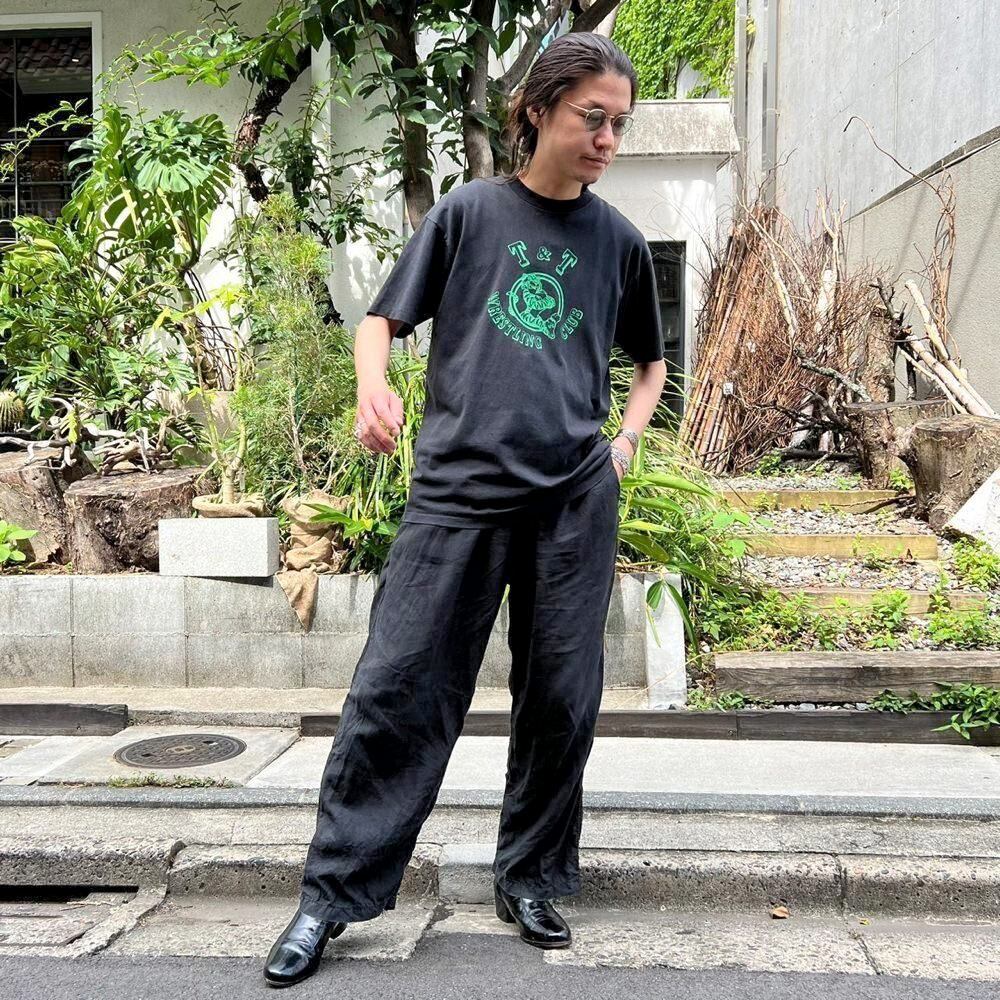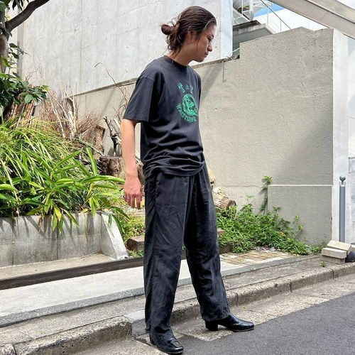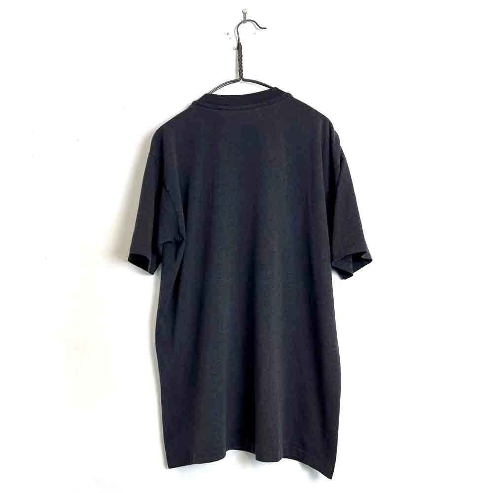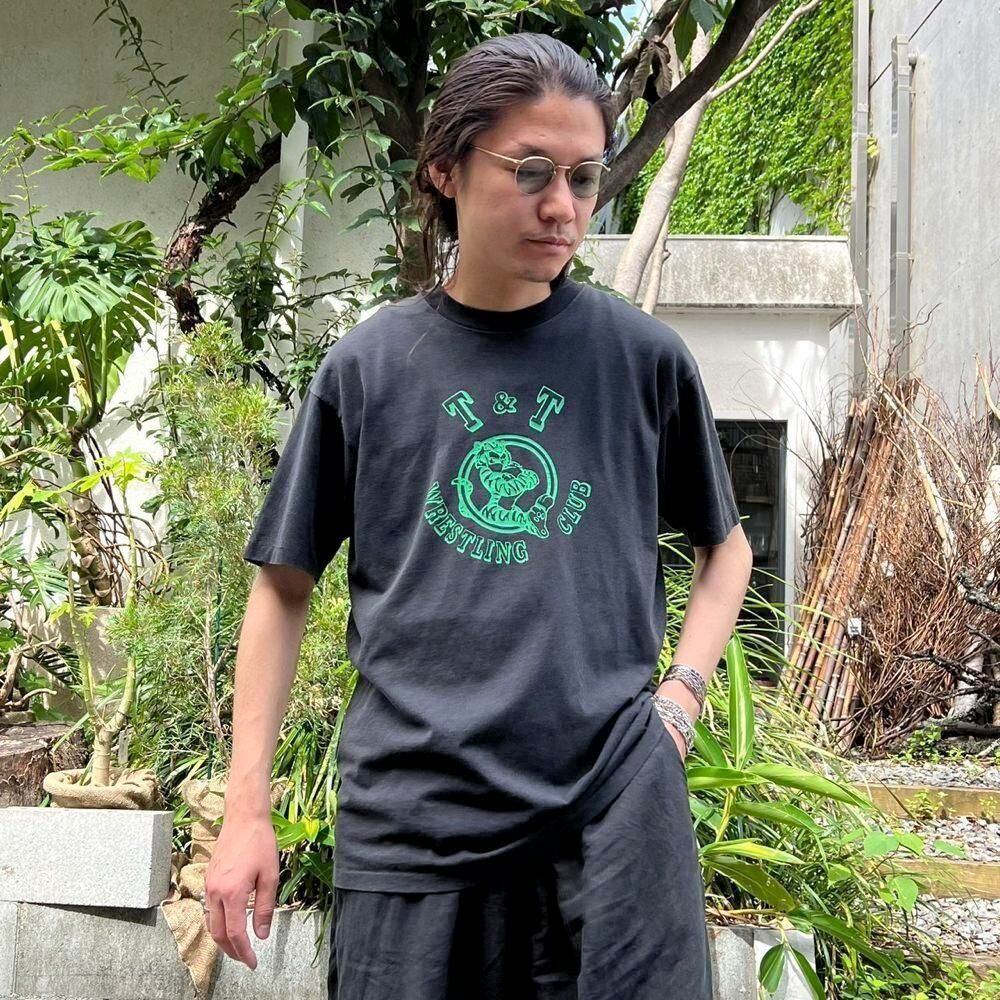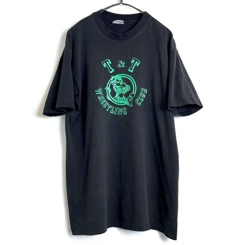 This is a club T-shirt from the 80s. It has a nicely faded black color with a vibrant green print. The body is a Hanes Fifty-Fifty, and the size is L. It is a versatile piece with a clean look.
