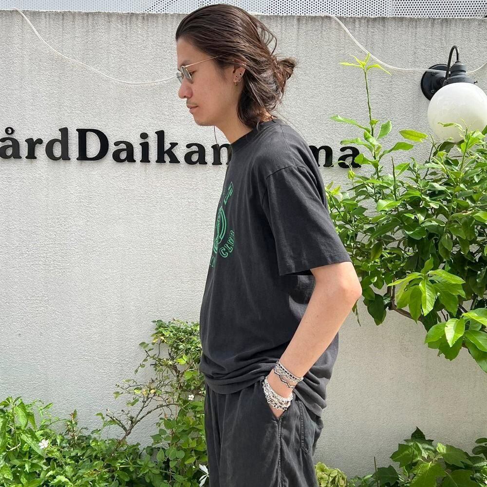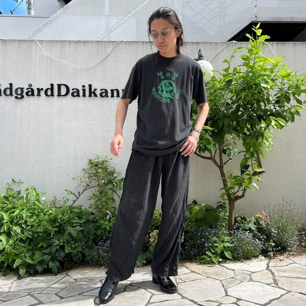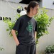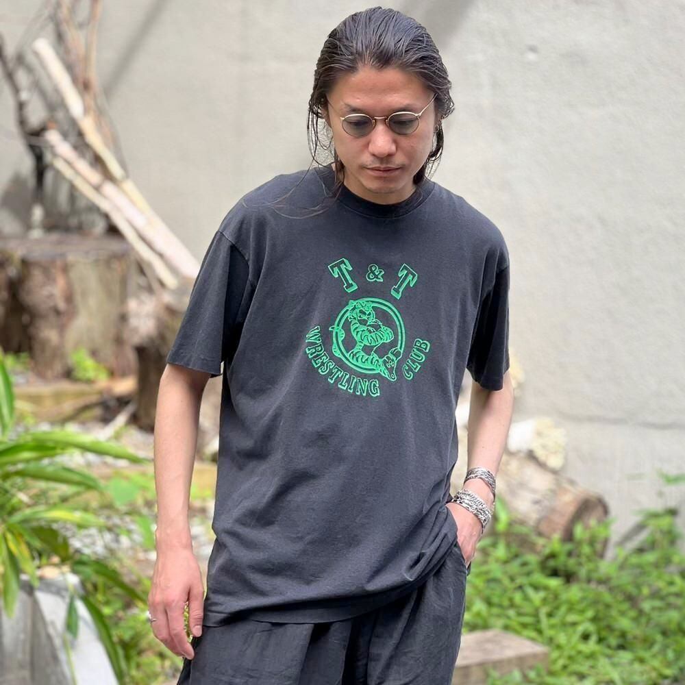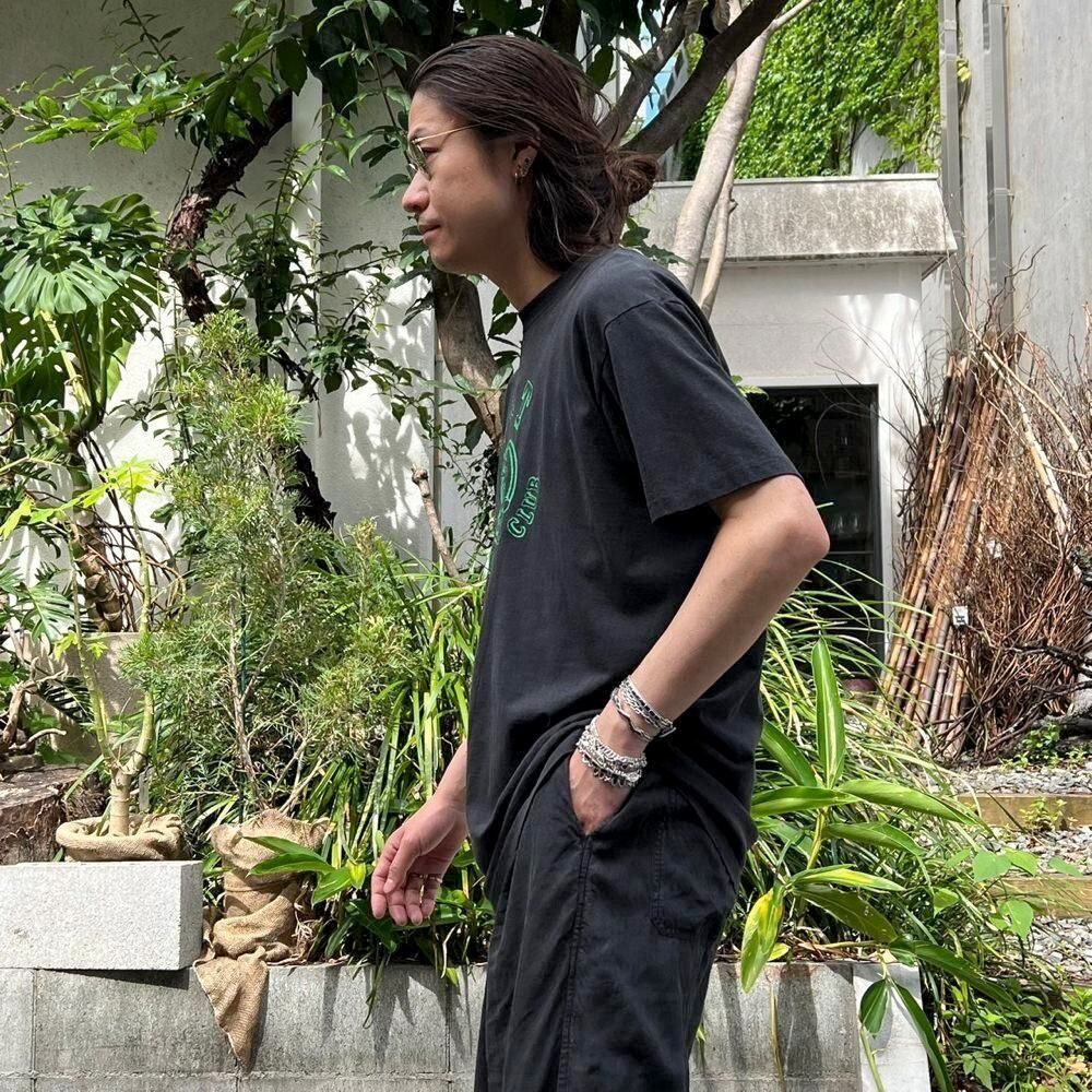 This is a club T-shirt from the 80s. It has a nicely faded black color with a vibrant green print. The body is a Hanes Fifty-Fifty, and the size is L. It is a versatile piece with a clean look.