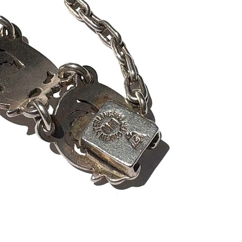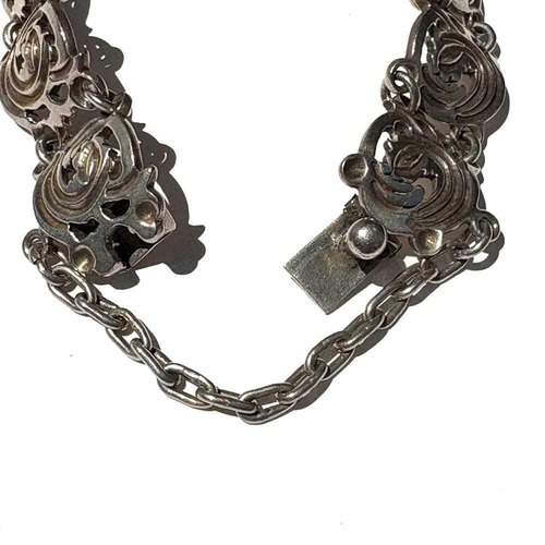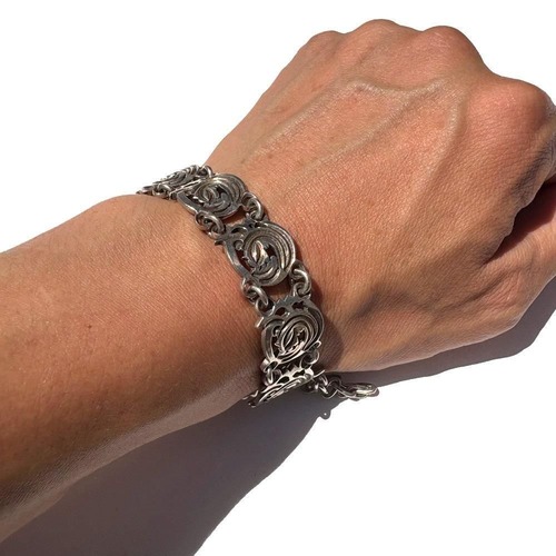 Judging from the hallmark, this piece dates to around the 1960s, and the design that resembles waves and plants is an ethnic, masculine design that is typical of Mexican vintage from that era.