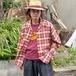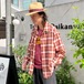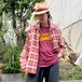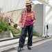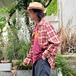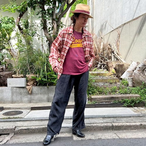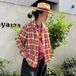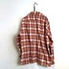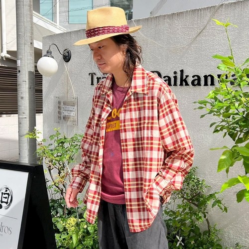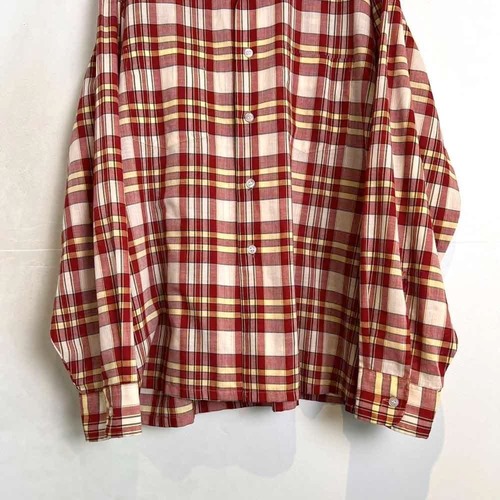 A 70s loop collar check shirt with a nostalgic check pattern in red, white, and yellow. Made of polyester and cotton for a smooth, dry feel. The size is 17.5 XL, with a loose, relaxed silhouette.