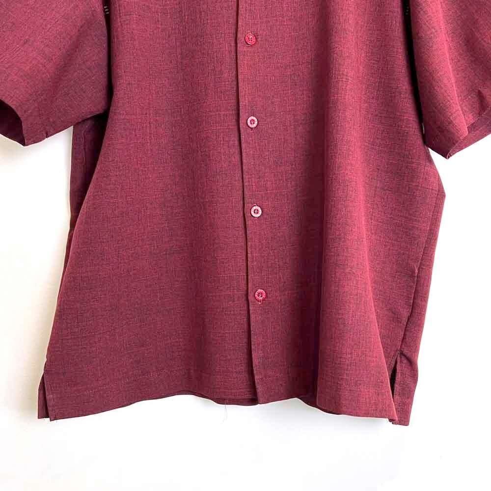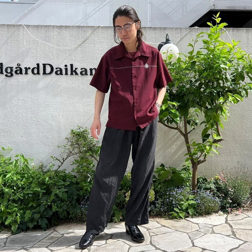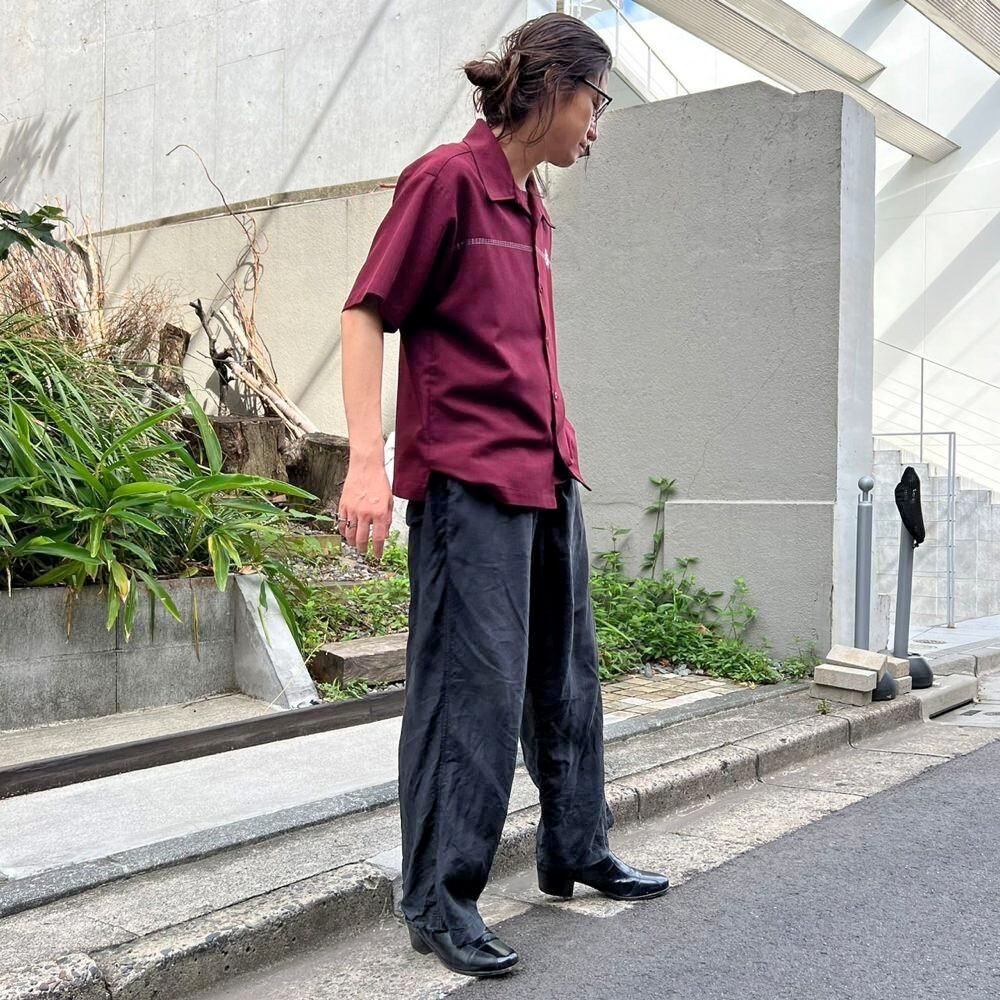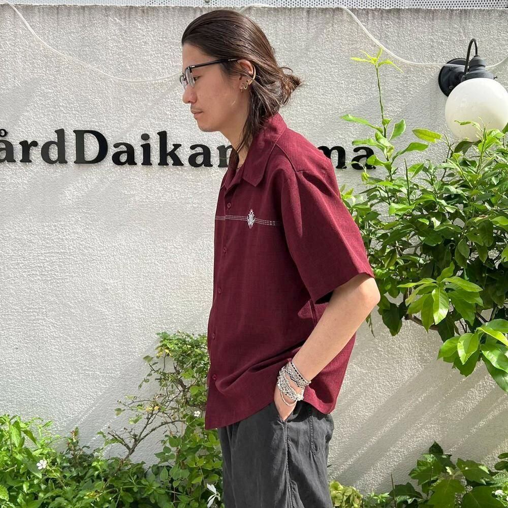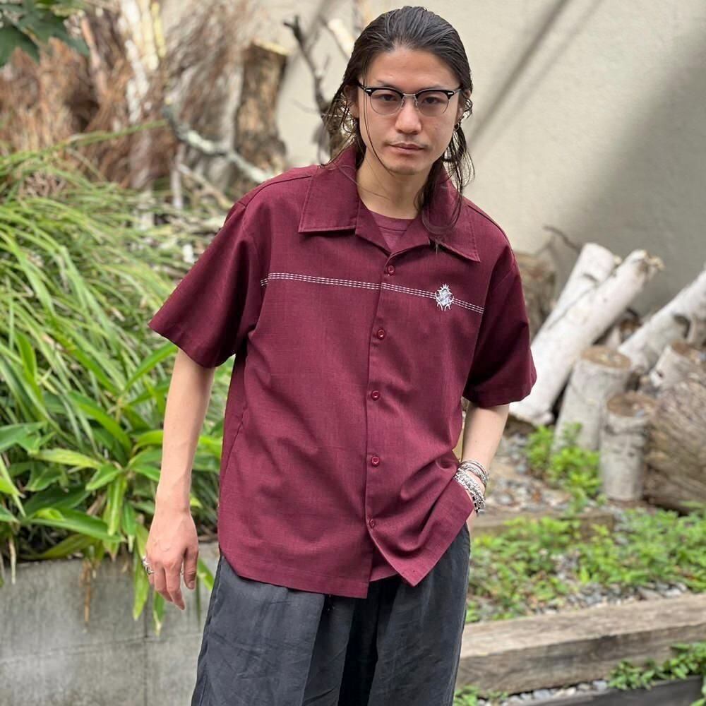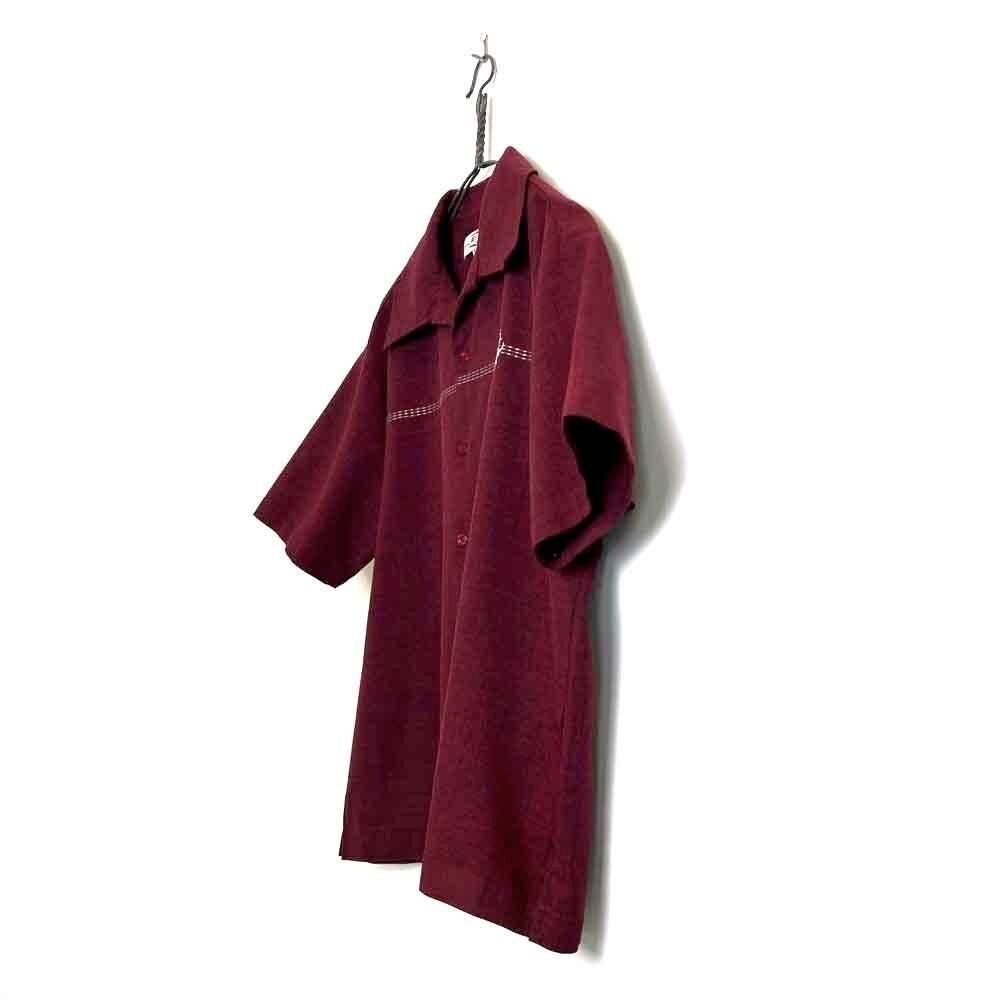 A short-sleeved open-collar shirt from the 80s. The burgundy and black chambray color scheme is sophisticated, and the embroidered emblem on the chest and the horizontal stitching are nice accents. This item is made of 100% polyester fabric with a smooth texture. The width of the body is just right, and the silhouette is well balanced with the length.