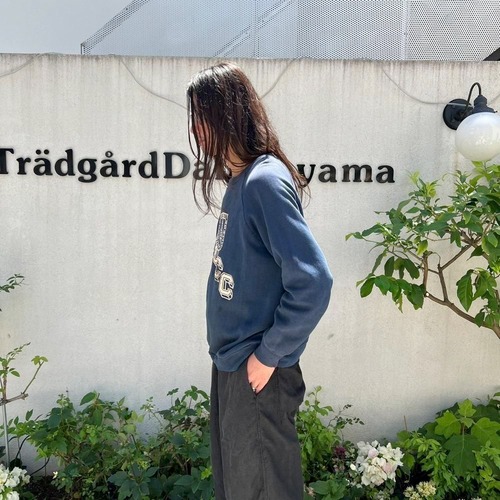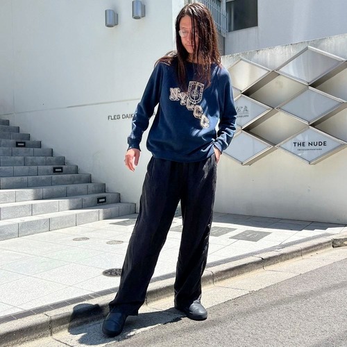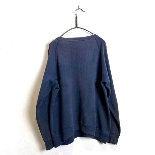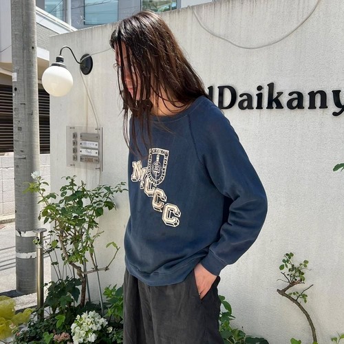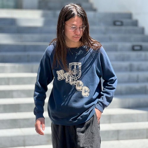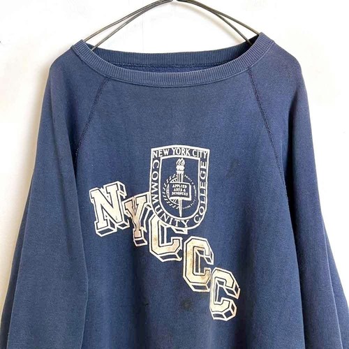 This vintage New York City Community College sweatshirt from the 1960s has a nicely faded navy color with some stains and scuffs on the fabric, giving it a great look. Its a relatively roomy fit for a sweatshirt from this era, creating a nice silhouette.