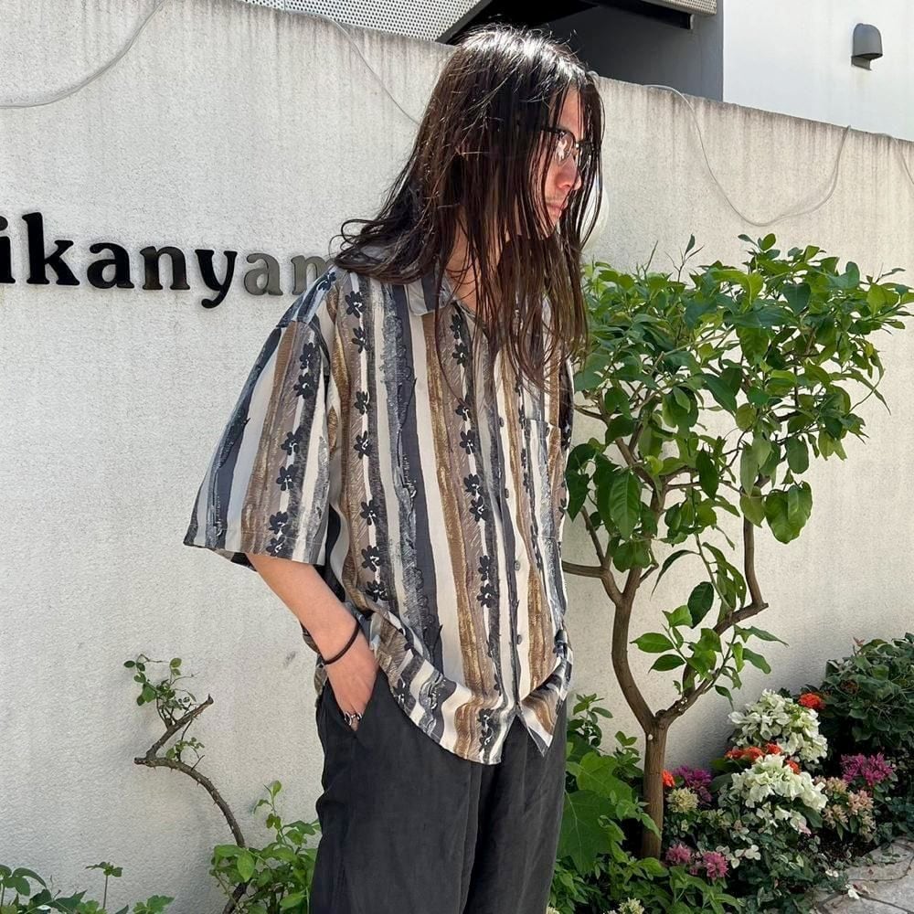 This 90s short-sleeved silk shirt features a sophisticated beige, brown, and black color scheme with an abstract art-like random stripe pattern.