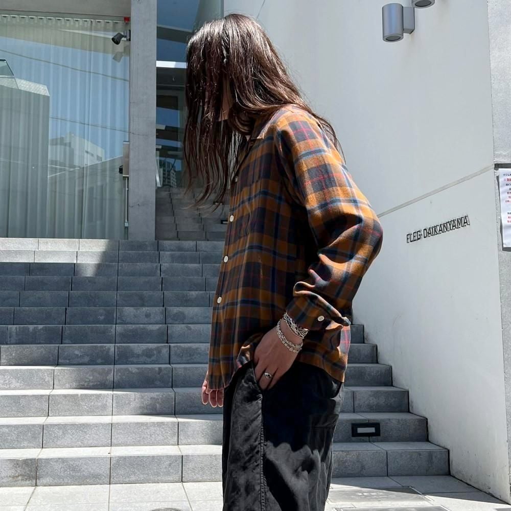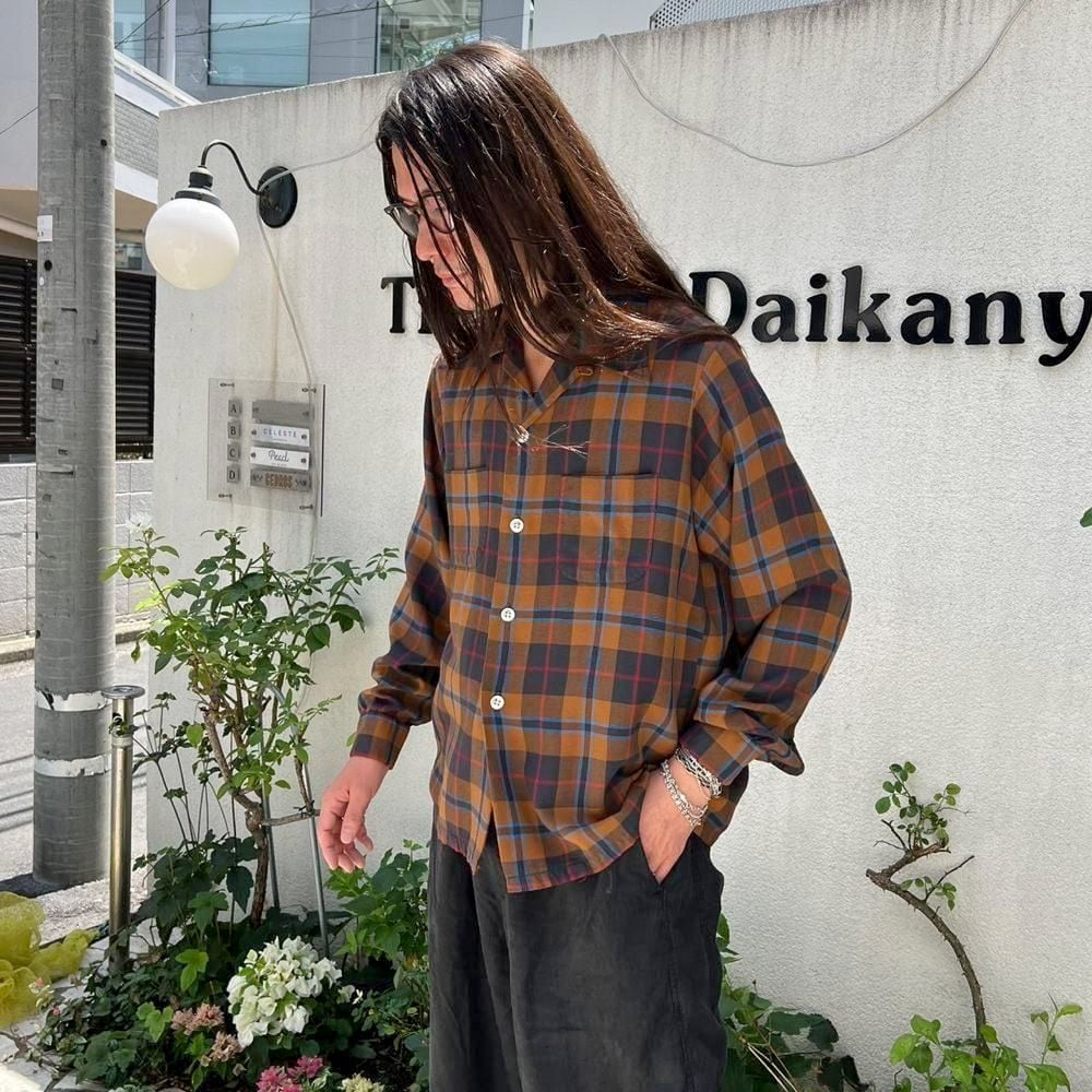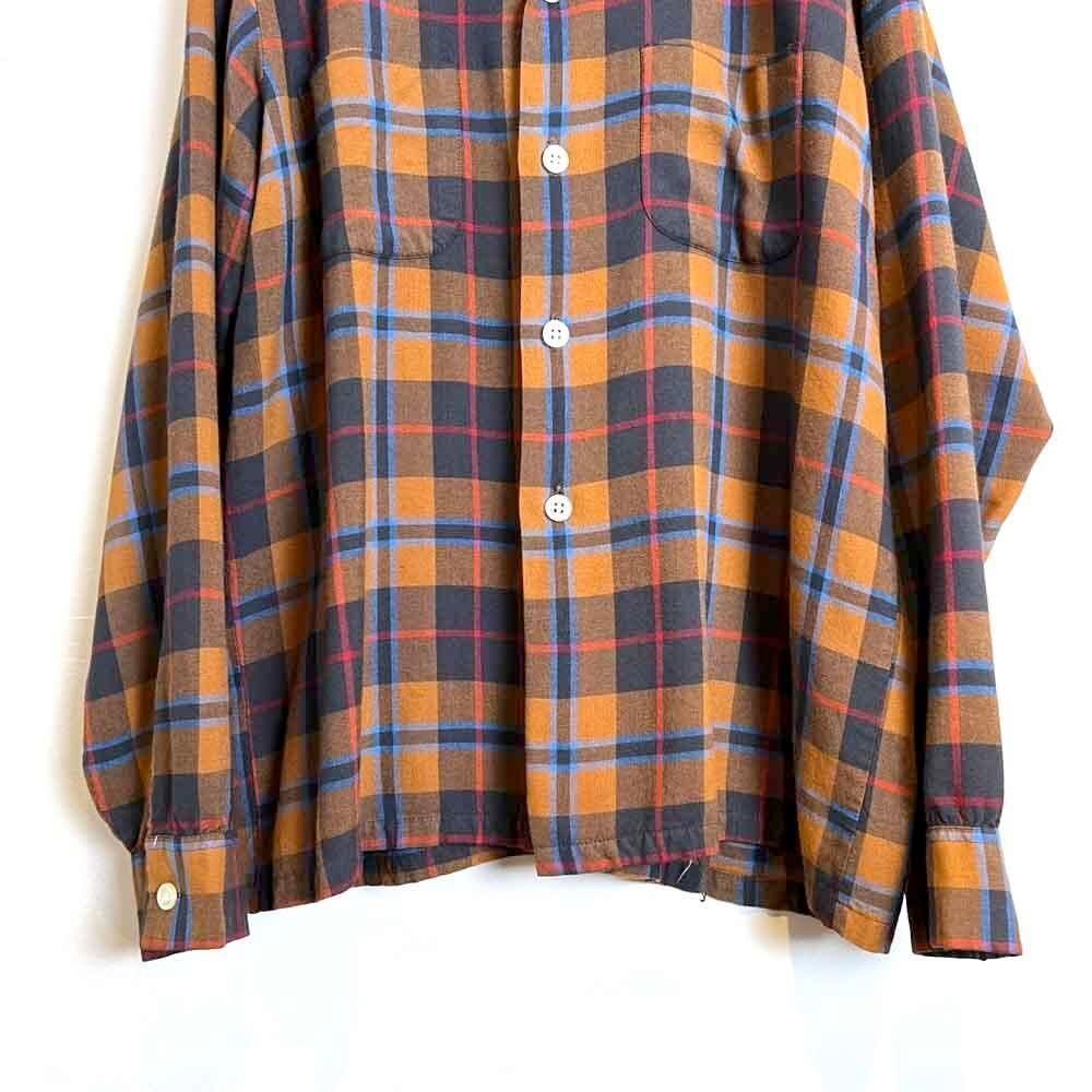 This 70s-inspired loop-collar rayon shirt features a masculine check pattern in deep shades of brown, black, blue, and red. The rayon and acetate fabric is soft and smooth, and feels great against the skin. The size is M (15.5), and it has a clean, just-right silhouette.
