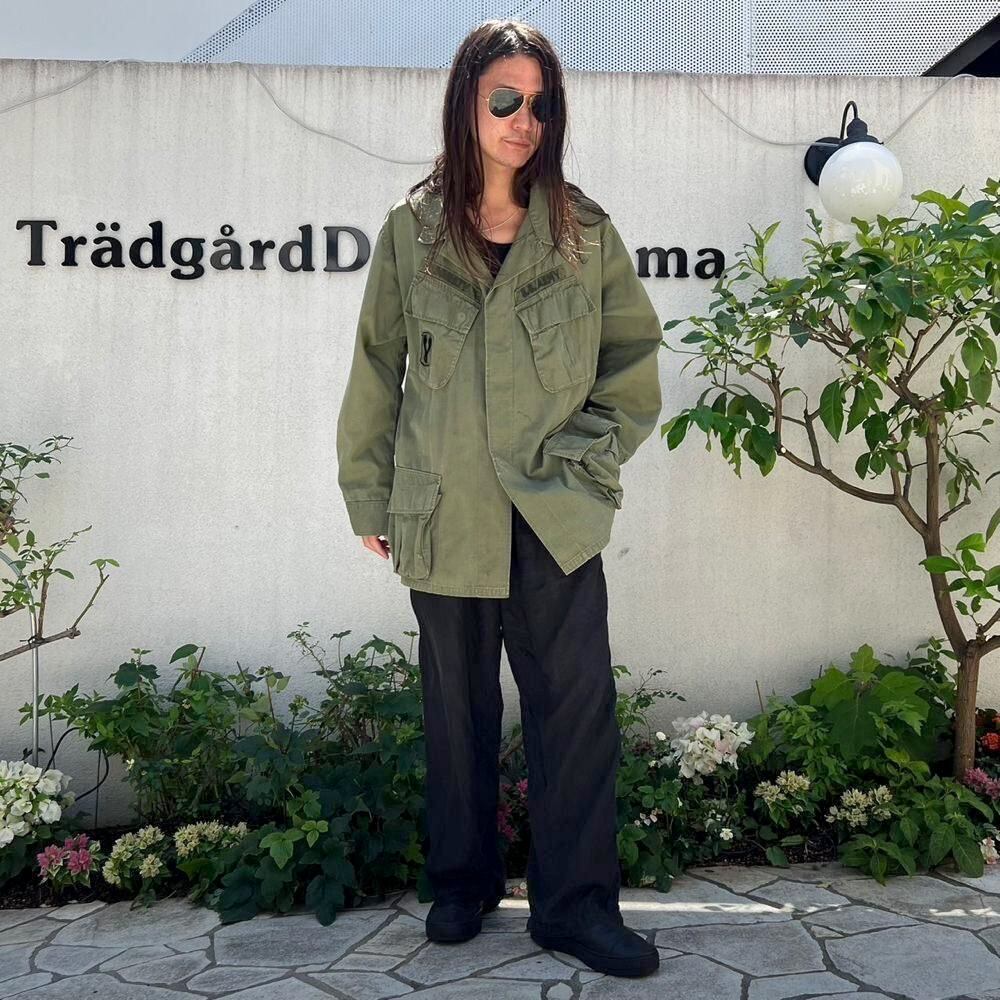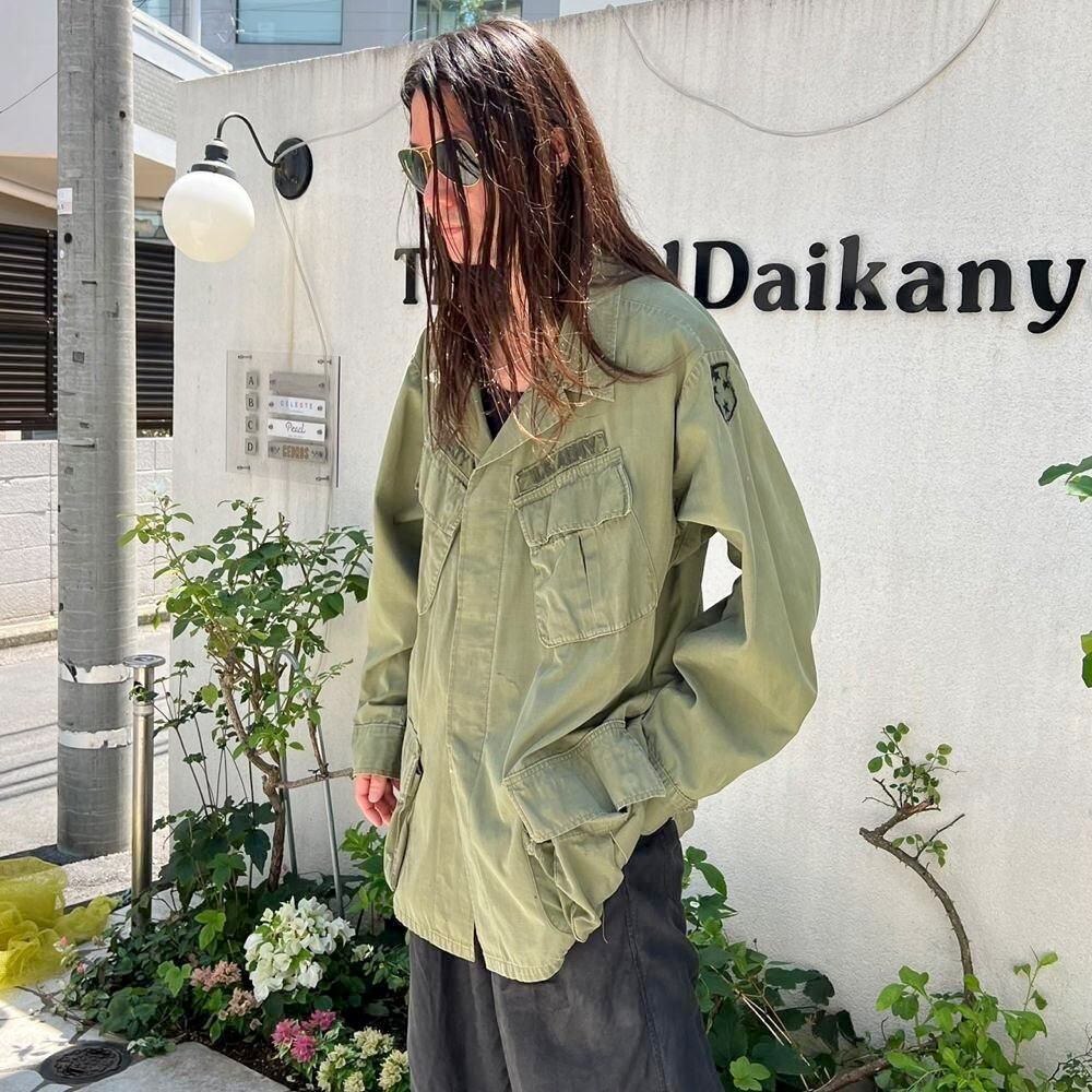 This is a 1960s US Army jungle fatigue jacket, 4th model. The fabric has softened over time and has a nice faded olive color. The size is unclear, but it fits loosely, about a size L.