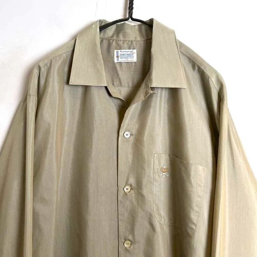 This 1960s Towncraft loop collar shirt features a sophisticated marbled gray and khaki colorway, and the embroidered detail on the chest pocket adds a touch of sophistication. Made of a light, smooth polyester/cotton fabric, this long-sleeved shirt is perfect for summer wear. Its relaxed fit and comfortable silhouette make it a great piece.
